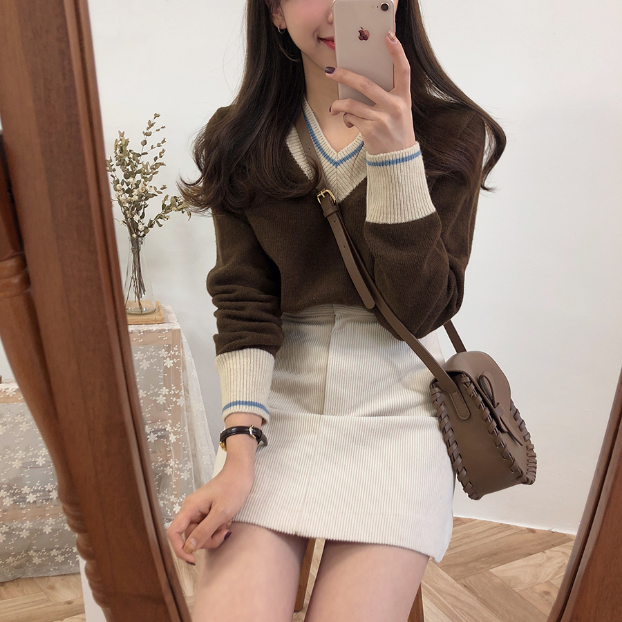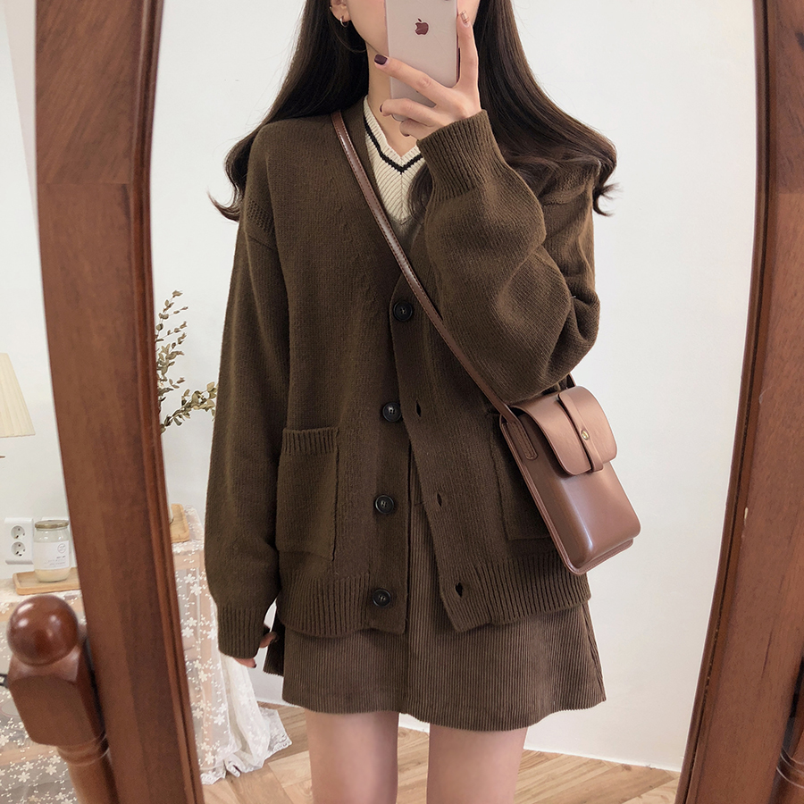 / 韓國新款寬松復古百搭毛衣外套時尚套裝甜美內搭V領針織衫兩件套