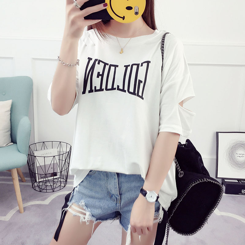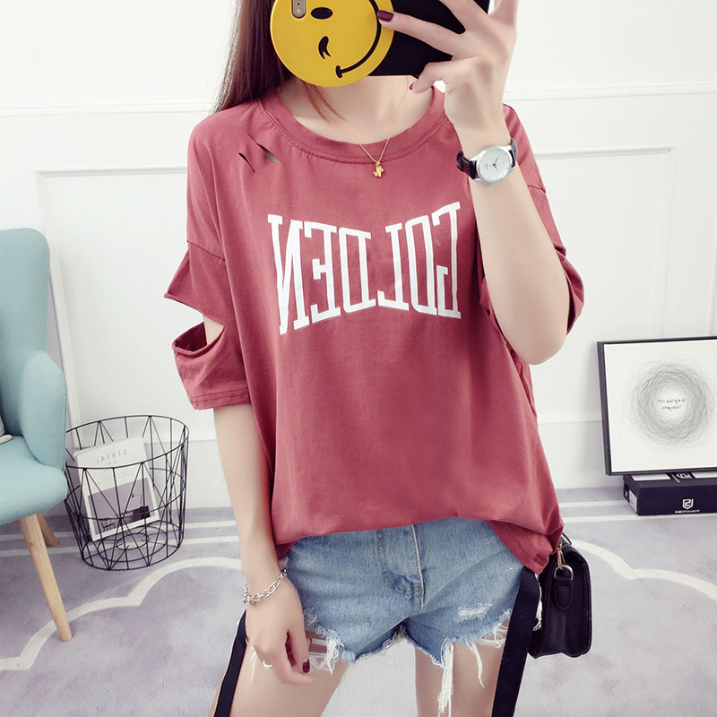 夏裝新款韓版學生寬松百搭短袖破洞衣服女t恤半袖潮女士體恤