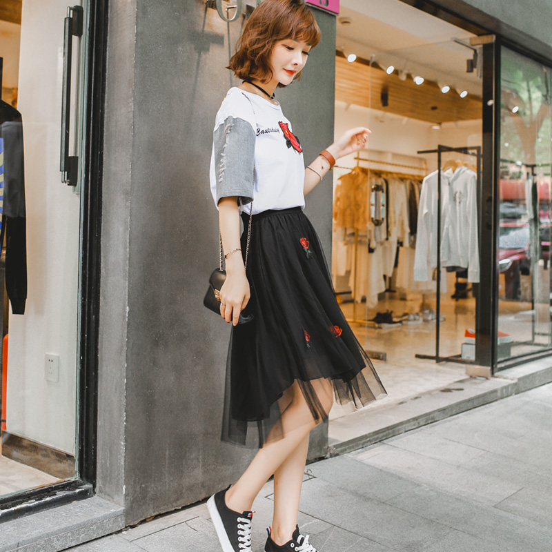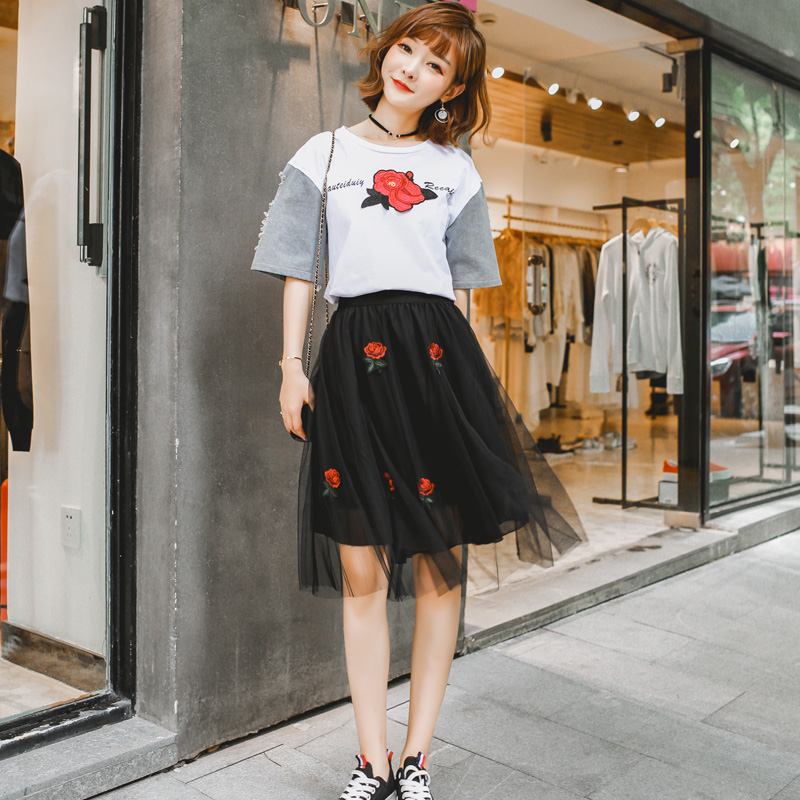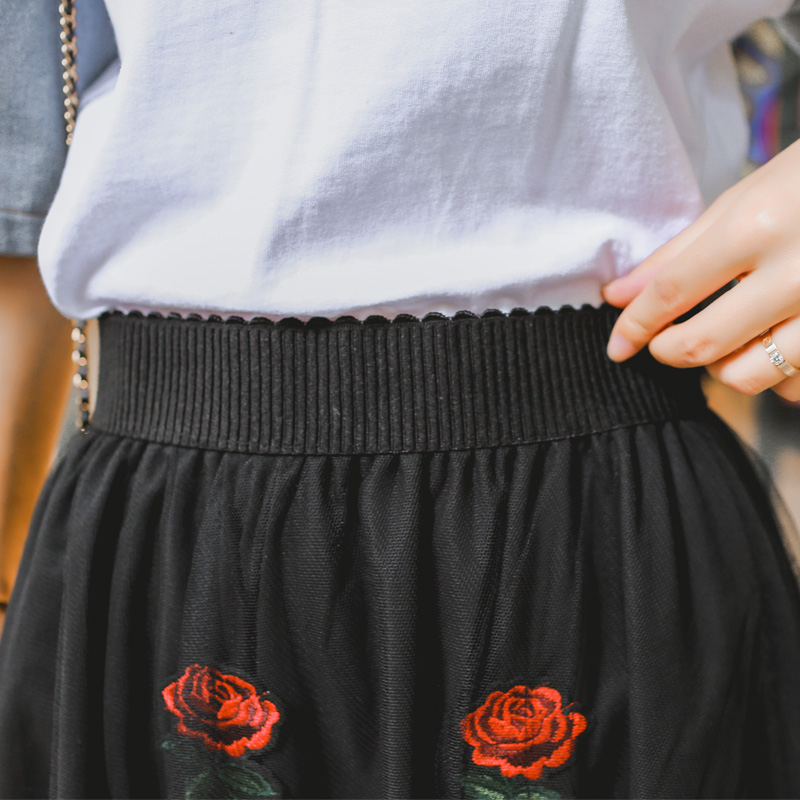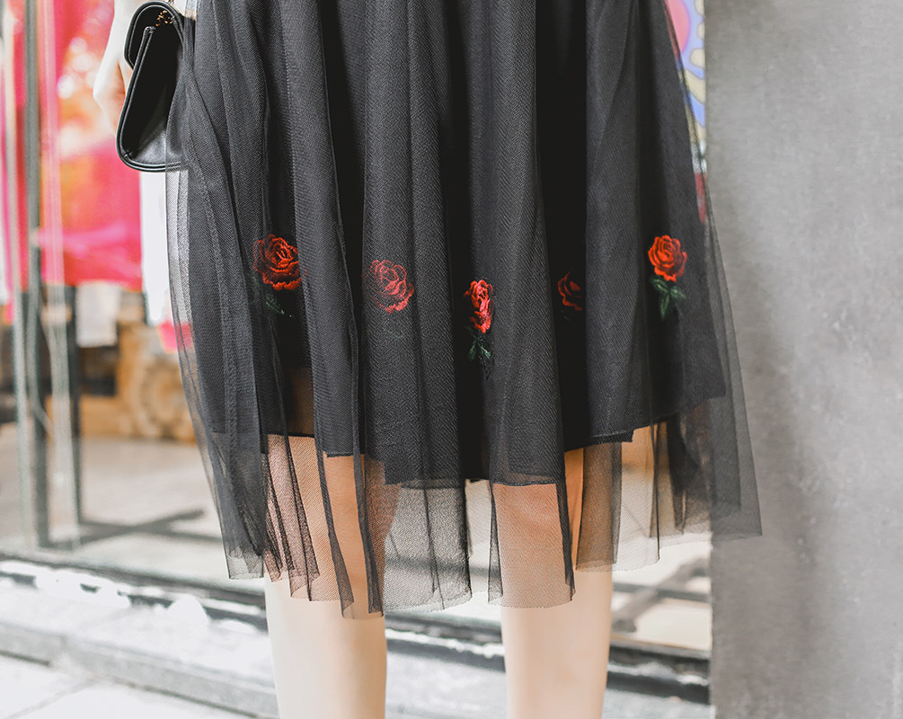 / 夏季網紗半身裙中長款百褶裙繡花蓬蓬裙a字裙中長裙紗裙中裙