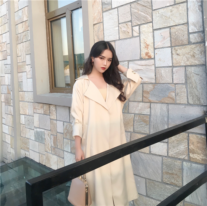 / 韓版復古chic女小香風時尚翻領氣質大袖子系帶收腰中長款風衣外套