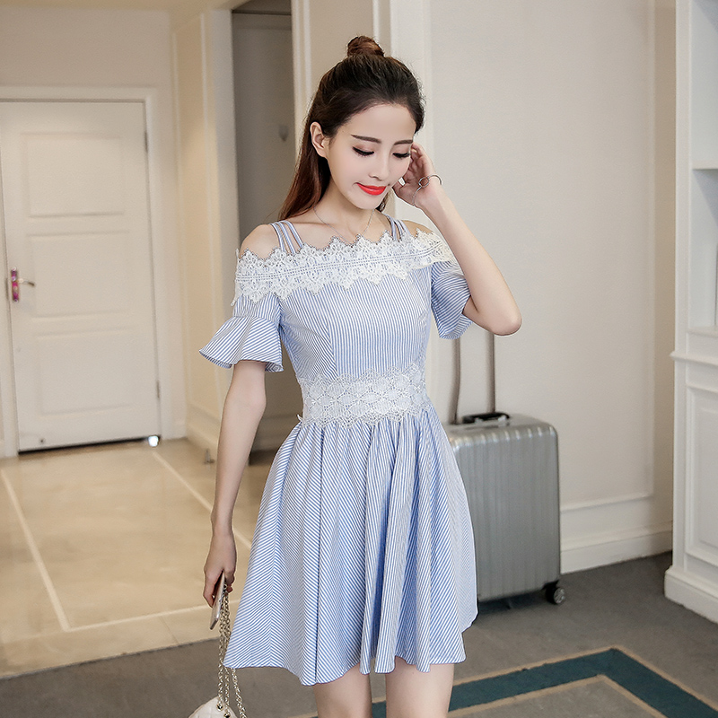 新款女裝韓版蕾絲拼接修身吊帶一字領露肩條紋短袖連衣裙女夏