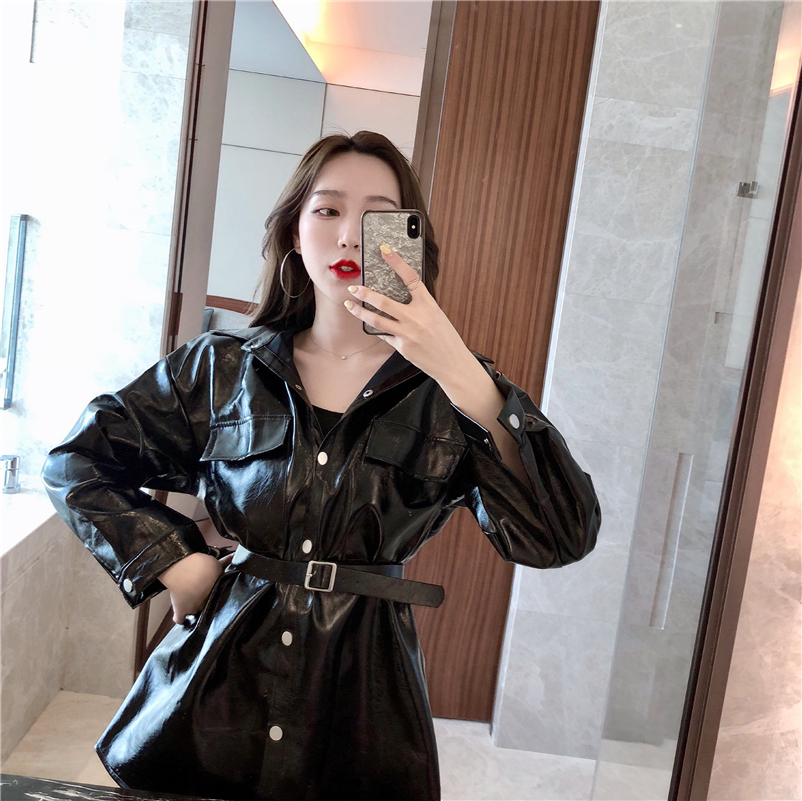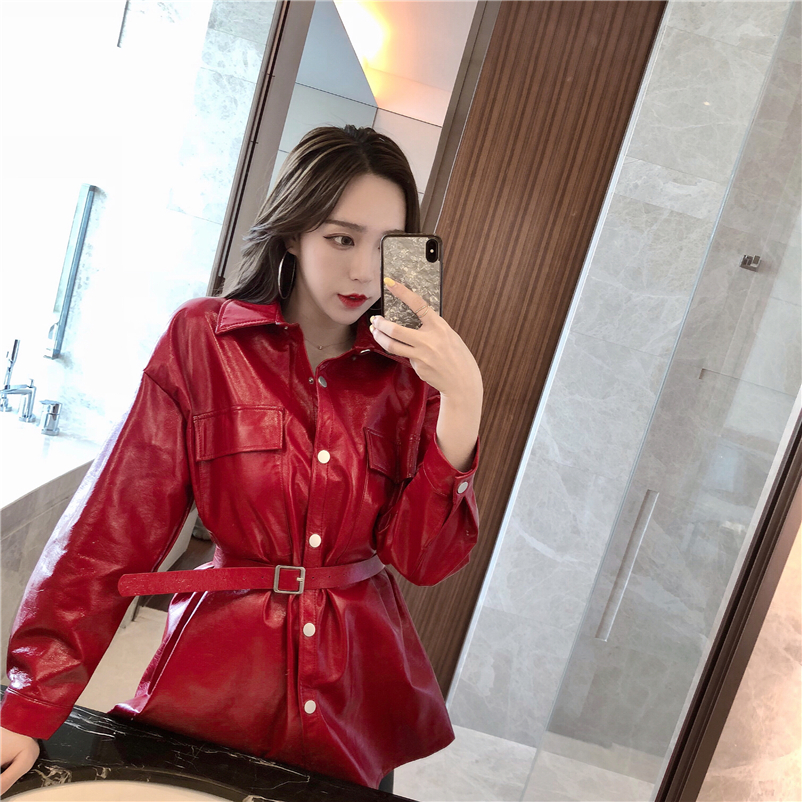韓風中長款系帶收腰皮外套秋冬款設計感單排扣氣質新款PU皮上衣女
