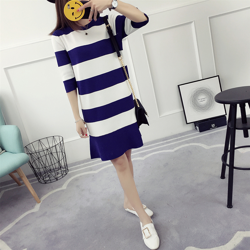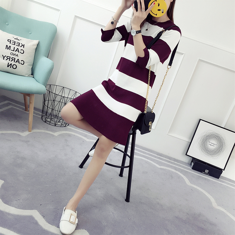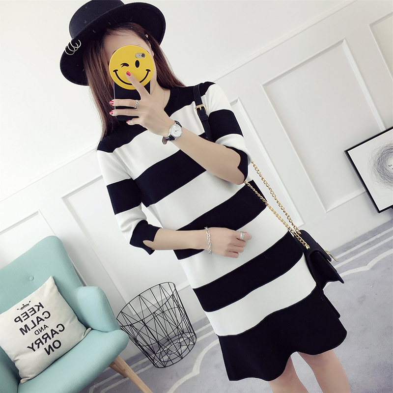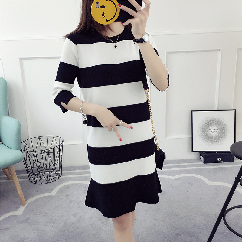 / 條紋針織連衣裙女春秋新款韓版顯瘦中長款打底魚尾裙春季百搭