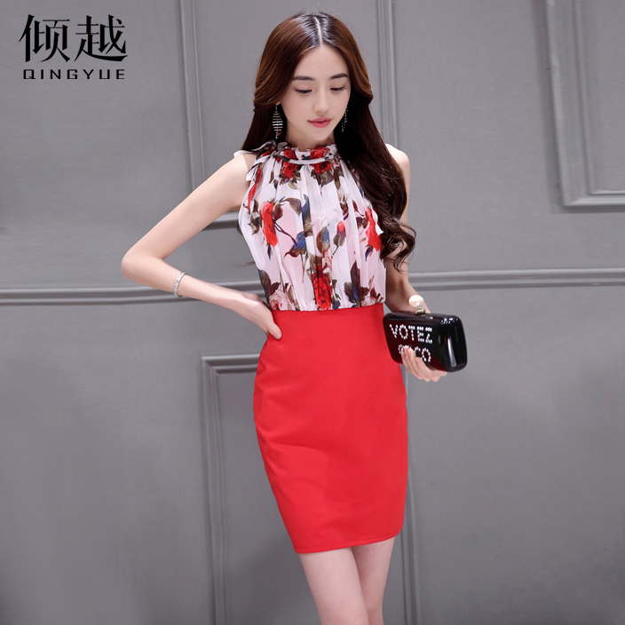 / 傾越韓版新款連體雪紡連衣裙時尚女裝性感2017夏修身包臀套裝裙潮