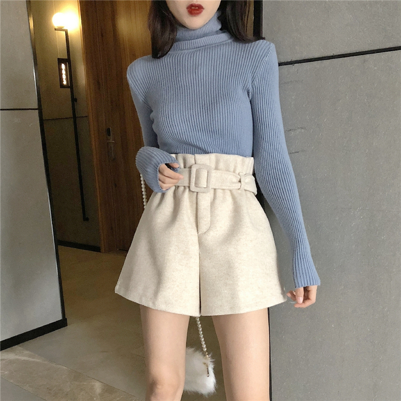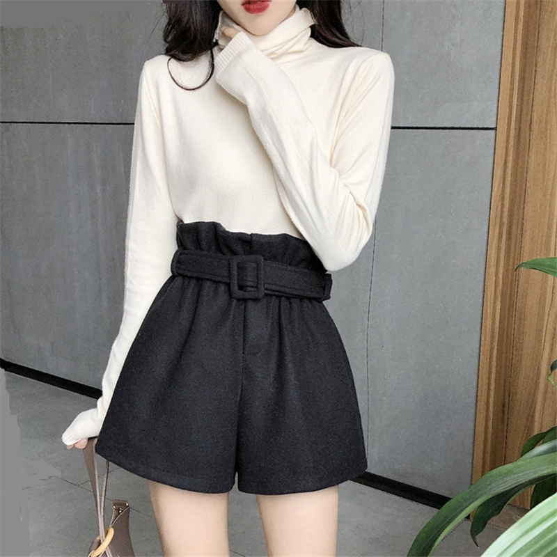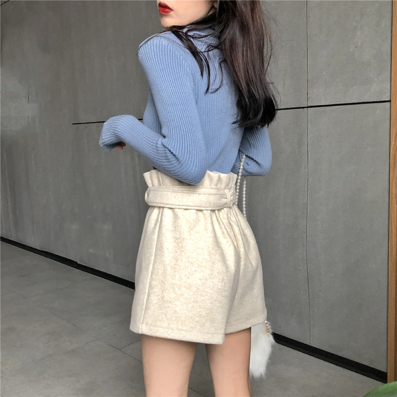 毛呢短褲女秋冬2018新款韓版高腰松緊腰百搭顯瘦闊腿褲靴褲潮