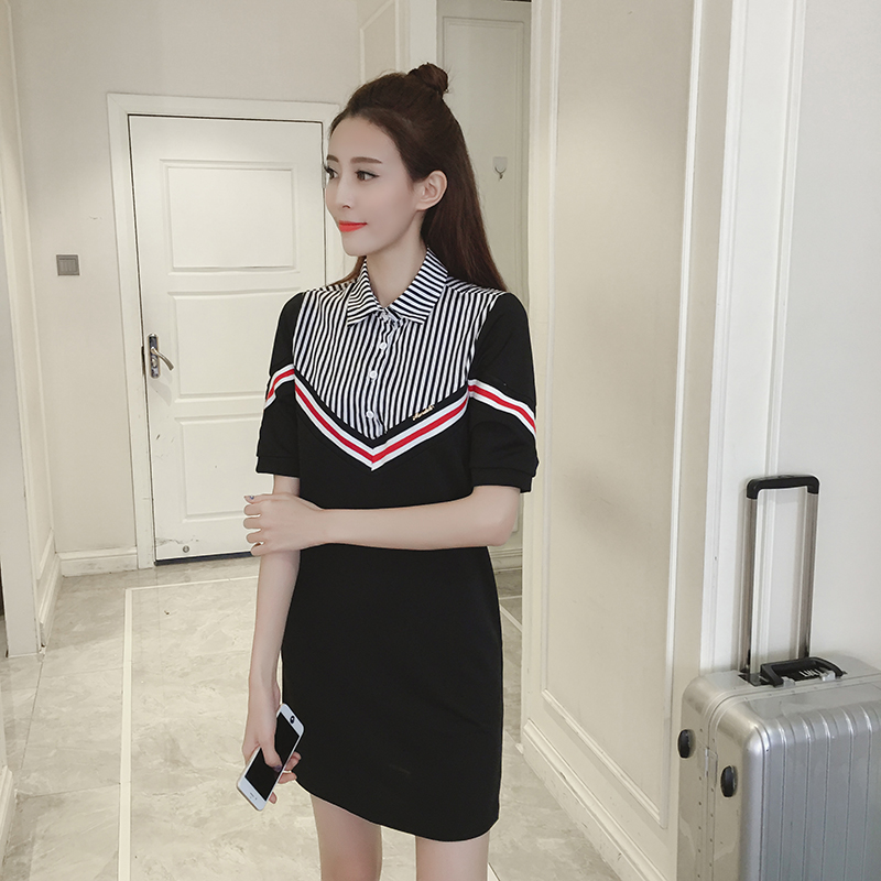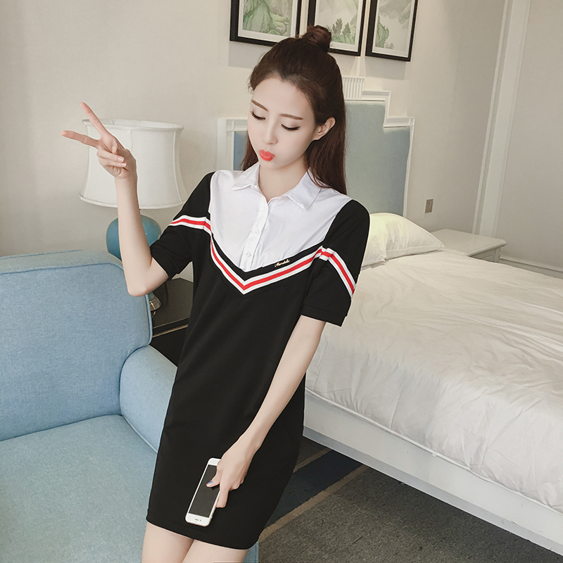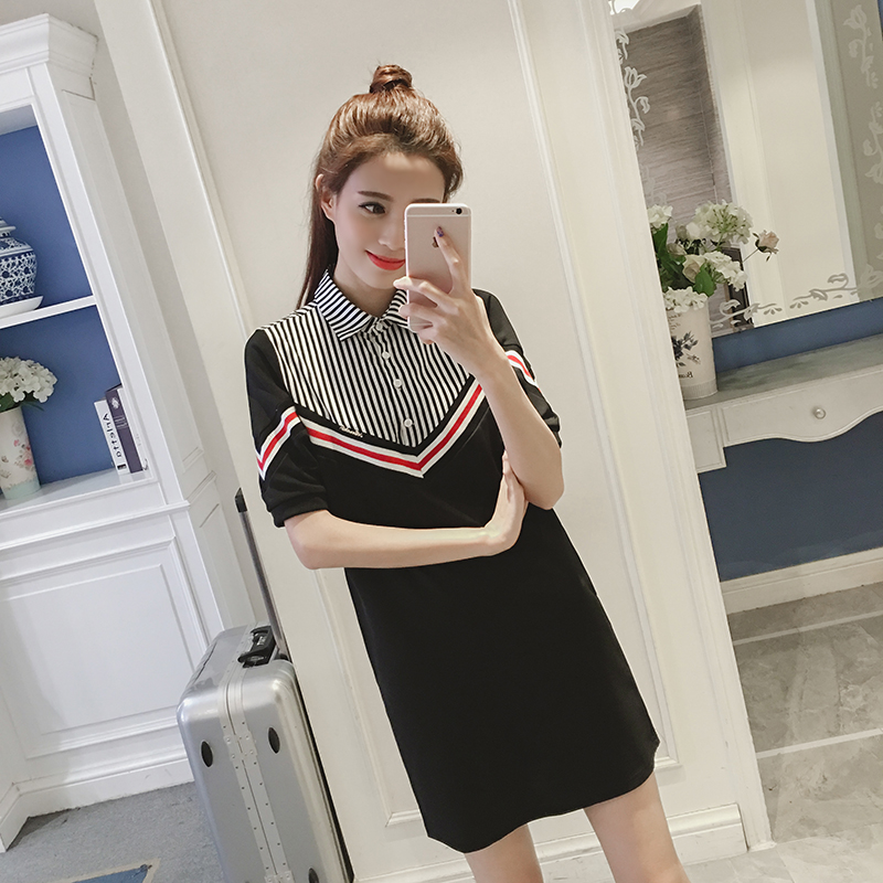 / 夏季新款女裝韓版假兩件撞色條紋顯瘦中長款短袖襯衫連衣裙潮
