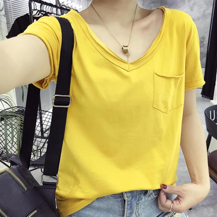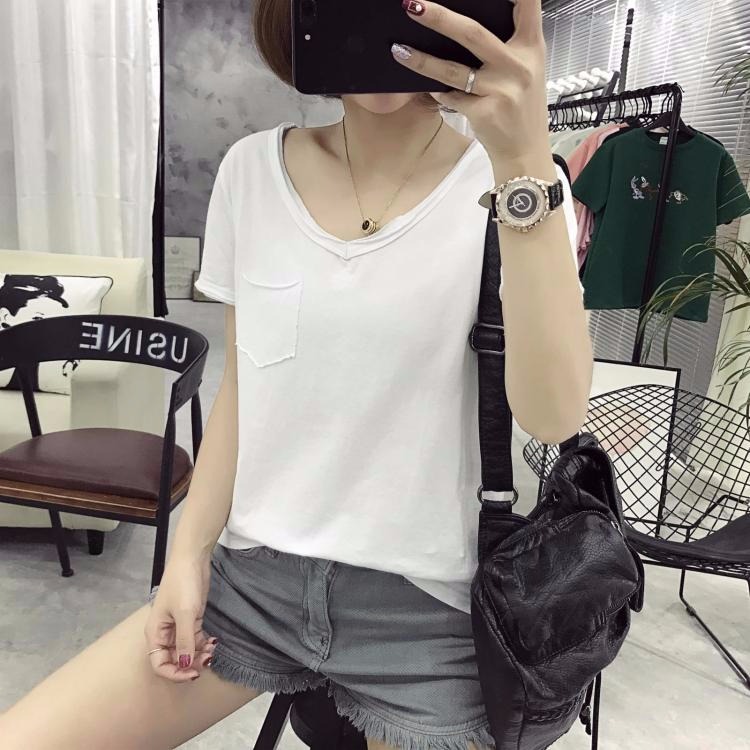 韓版新款寬松夏季上衣純色t恤女裝短袖顯瘦大碼學生半袖V領打底衫