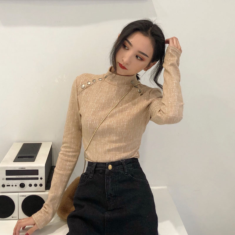 chic早秋上衣女新款韓版百搭復古港味金屬扣立領修身打底衫T恤潮
