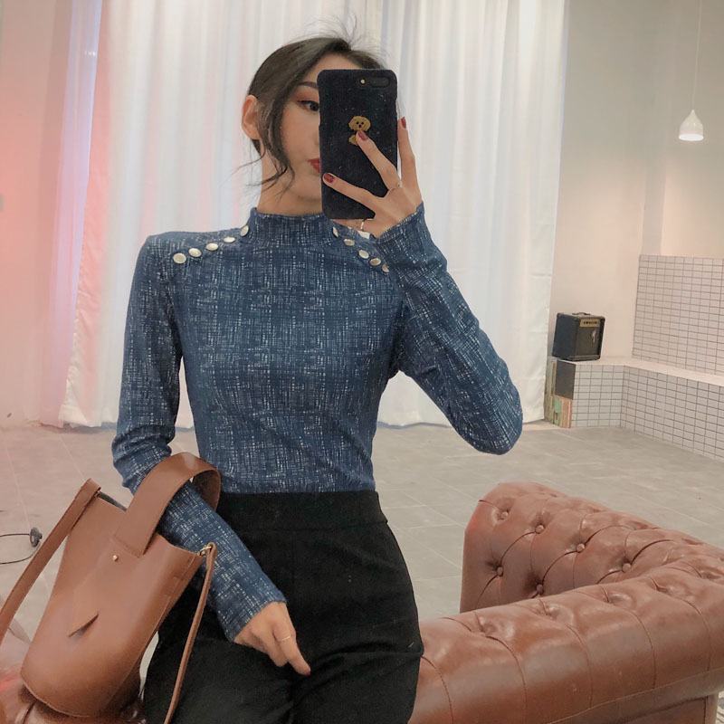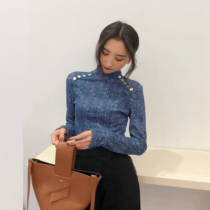 / chic早秋上衣女新款韓版百搭復古港味金屬扣立領修身打底衫T恤潮