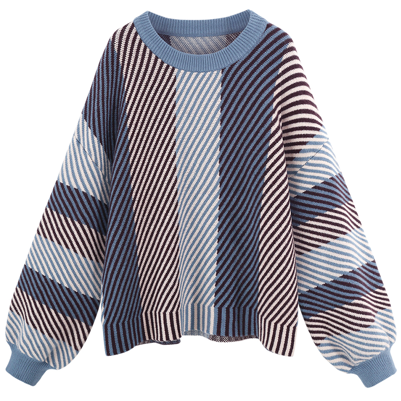 MG小象燈籠袖毛衣女寬松條紋上衣冬季新款學生圓領套頭針織毛線衣