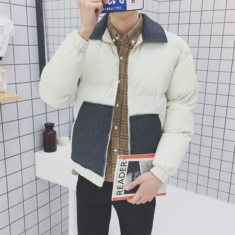 / 男裝韓版呢料拼色男士連帽棉服寬松短款棉衣外套潮