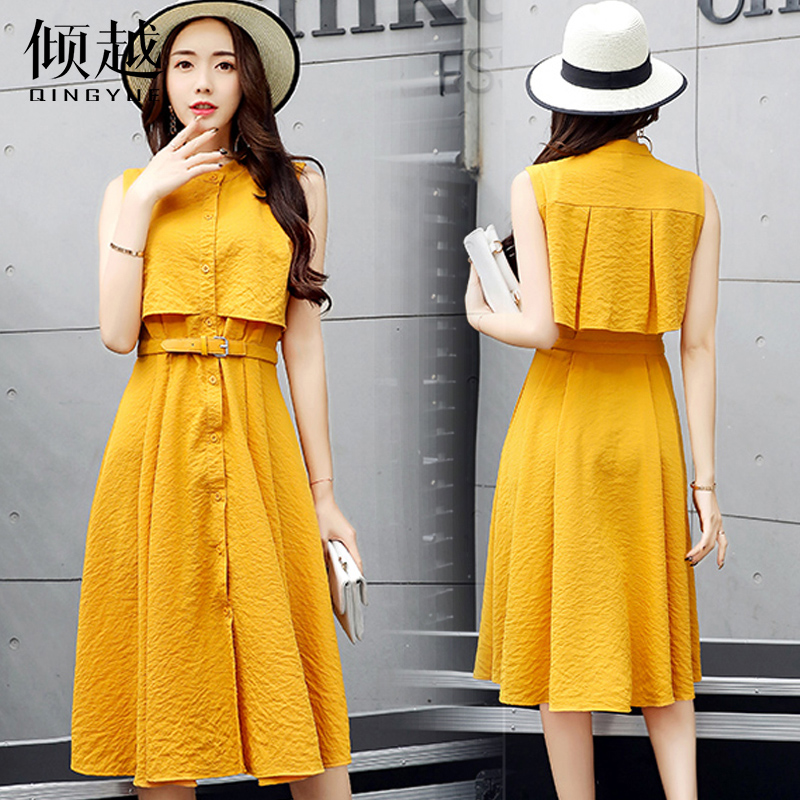 傾越2017夏裝新款韓版顯瘦無袖襯衫連衣裙女裝氣質中長款A字裙潮