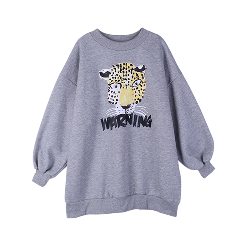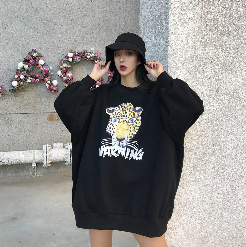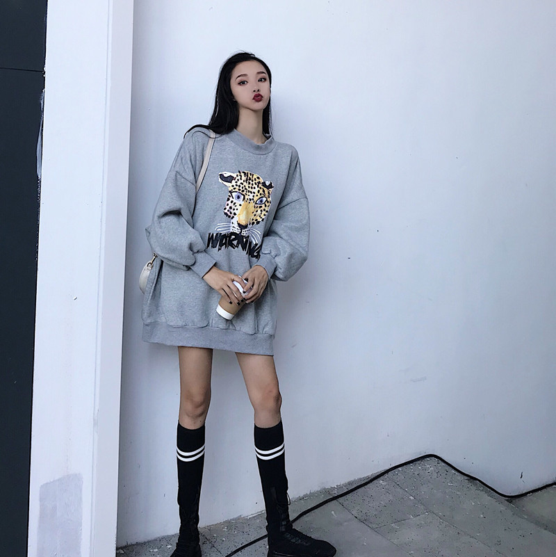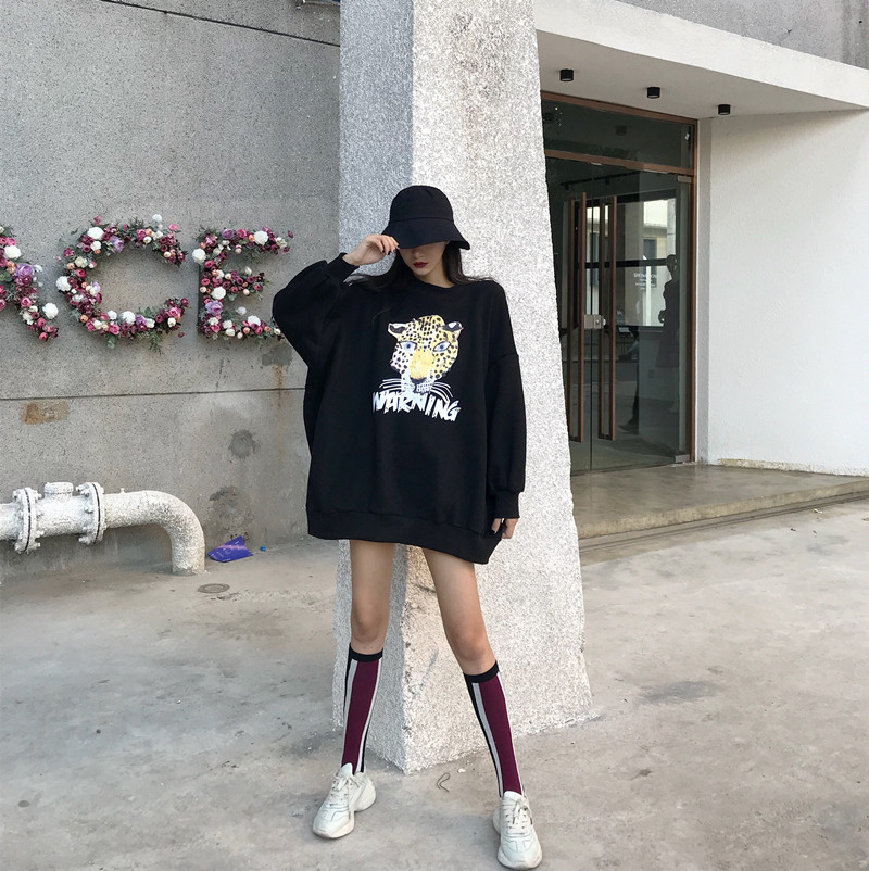 / 港風圓領新款套頭oversize慵懶印花加絨加厚中長款女裝衛衣外套潮