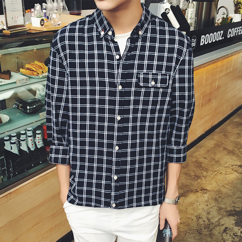 / 港風男裝文藝格子潮男七分袖襯衫港風日韓寬松襯衣