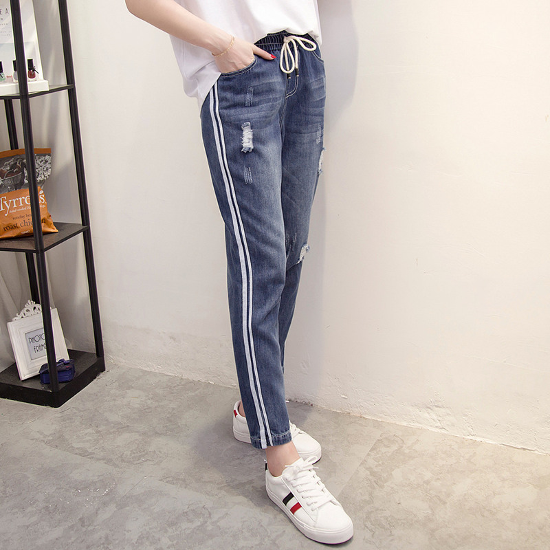 破洞牛仔褲女春夏季新款寬松顯瘦條紋低腰褲子韓版系帶小腳褲
