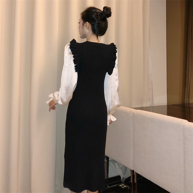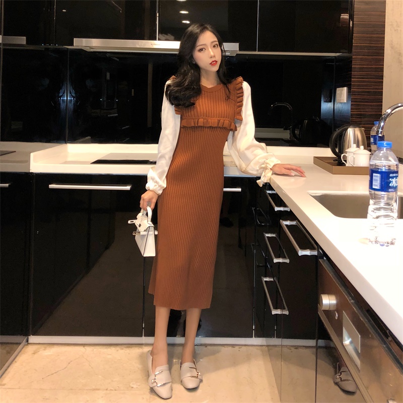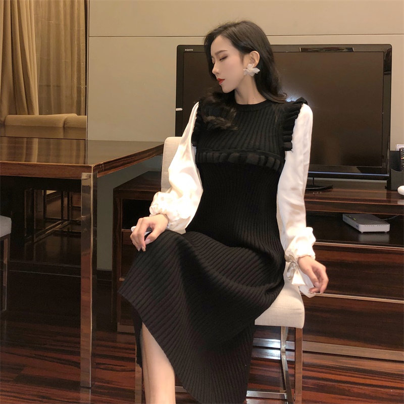 / 新款初秋溫柔風時尚氣質拼接假兩件針織連衣裙復古長袖百搭長裙女
