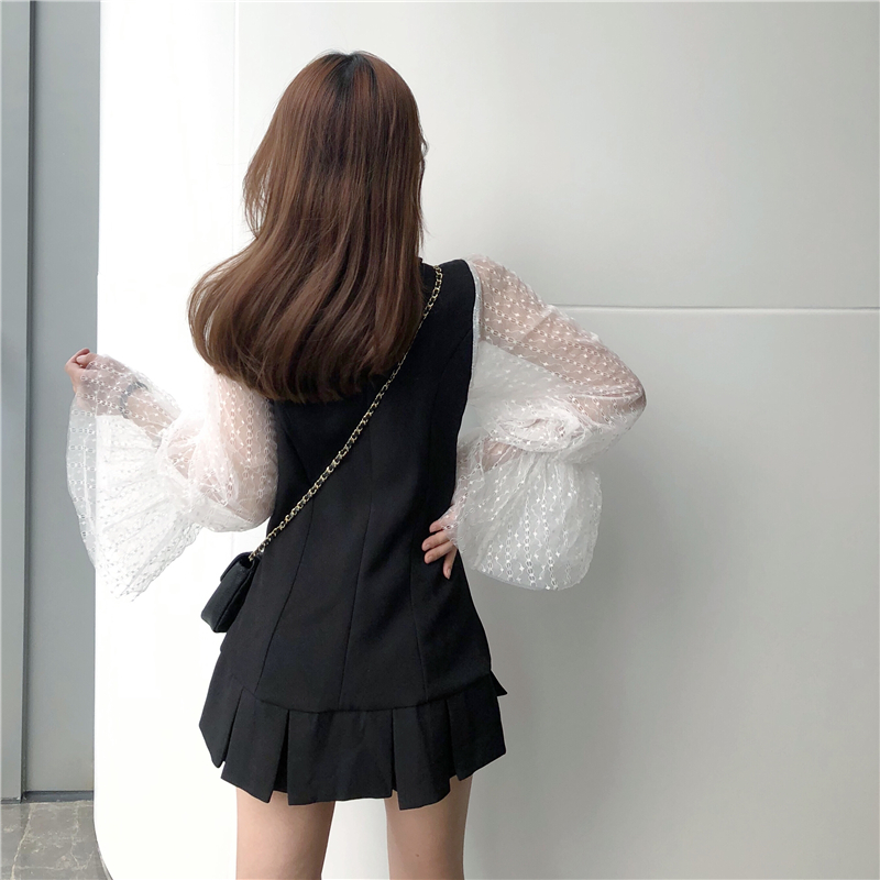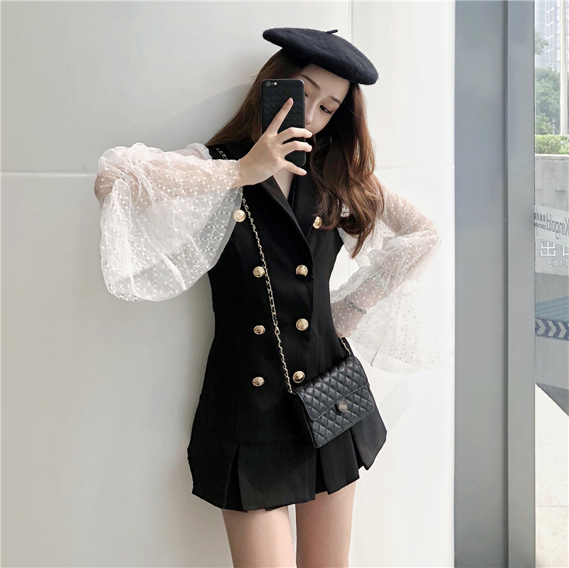 / 韓版修身顯瘦短裙chic氣質喇叭袖拼接雙排扣連衣裙秋裝2018新款女
