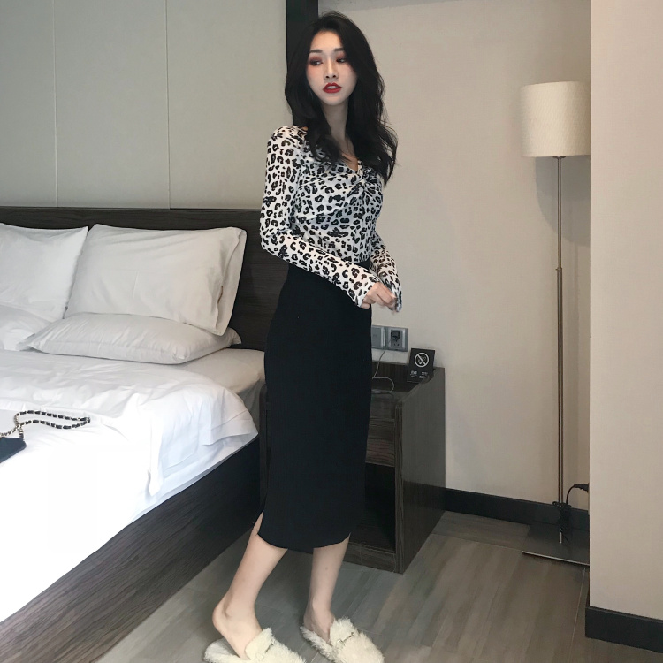 / 修身顯瘦新款韓版V領針織衫緊身長袖短款性感豹紋打底衫上衣女裝