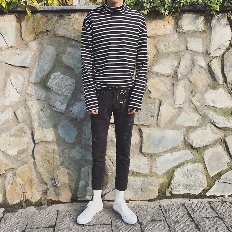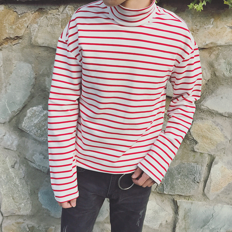 / 男裝韓版春季新款潮男T恤男士百搭長袖條紋打底T恤