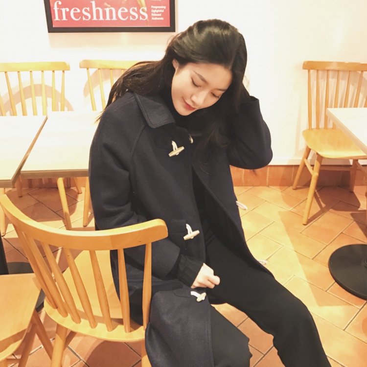 韓國chic秋冬款復古簡約牛角扣中長款夾棉加厚毛呢外套大衣女