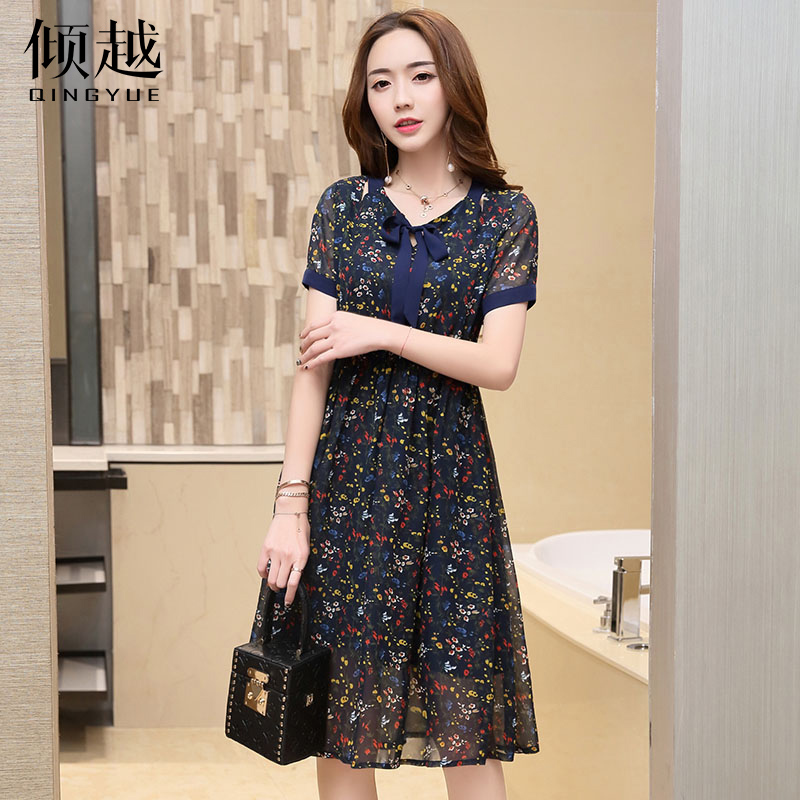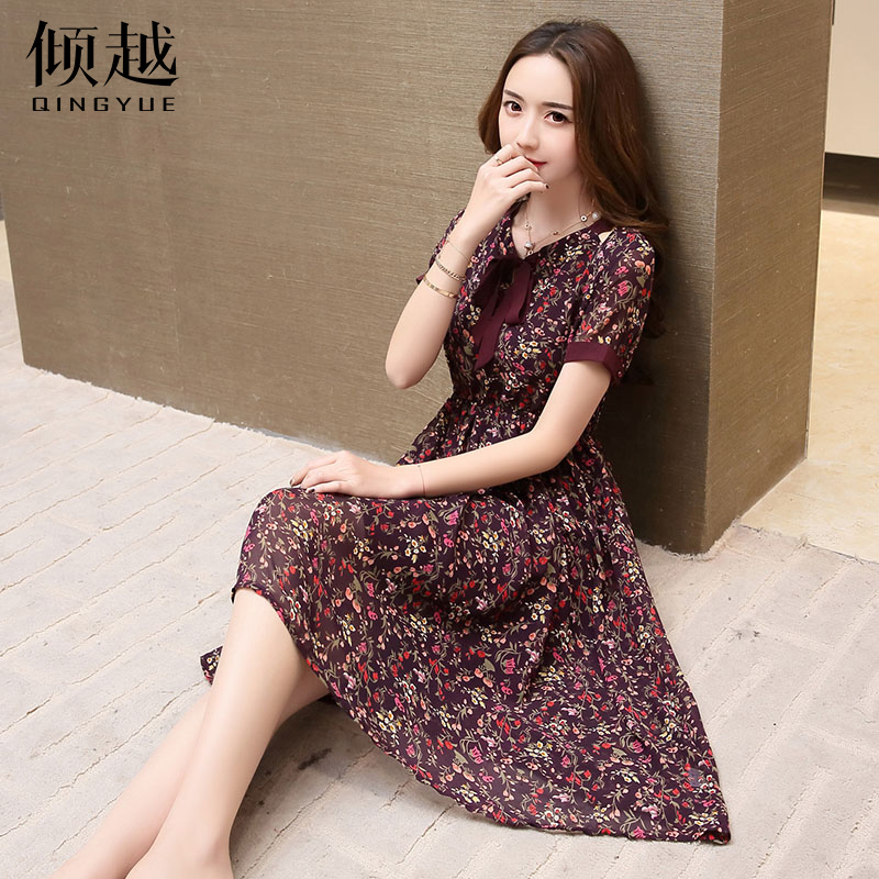 傾越碎花印花連衣裙女夏短袖蝴蝶結百褶a字裙2017春裝新款裙子潮