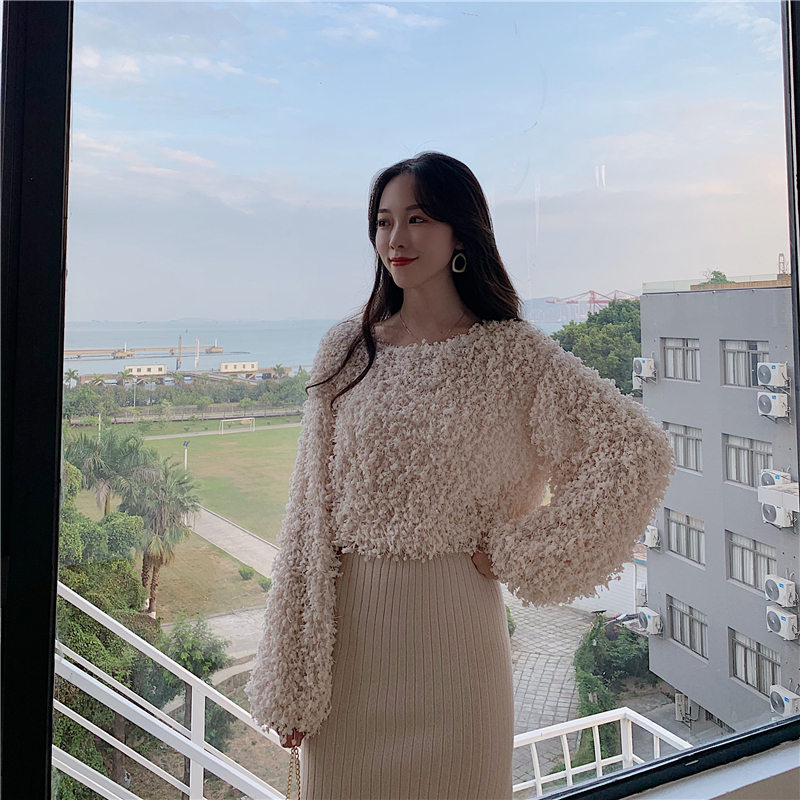 / 韓版寬松顯瘦燈籠袖毛毛上衣兩件套開叉中長款針織半身裙時尚套裝