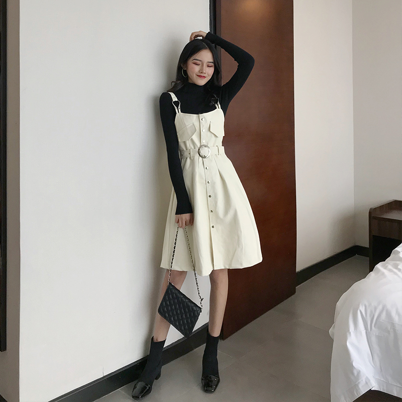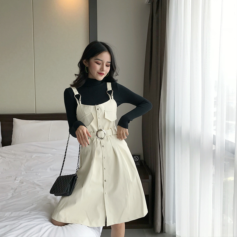 / 港風時尚秋冬新款韓版套裝背帶連衣皮裙長袖修身打底針織衫兩件套