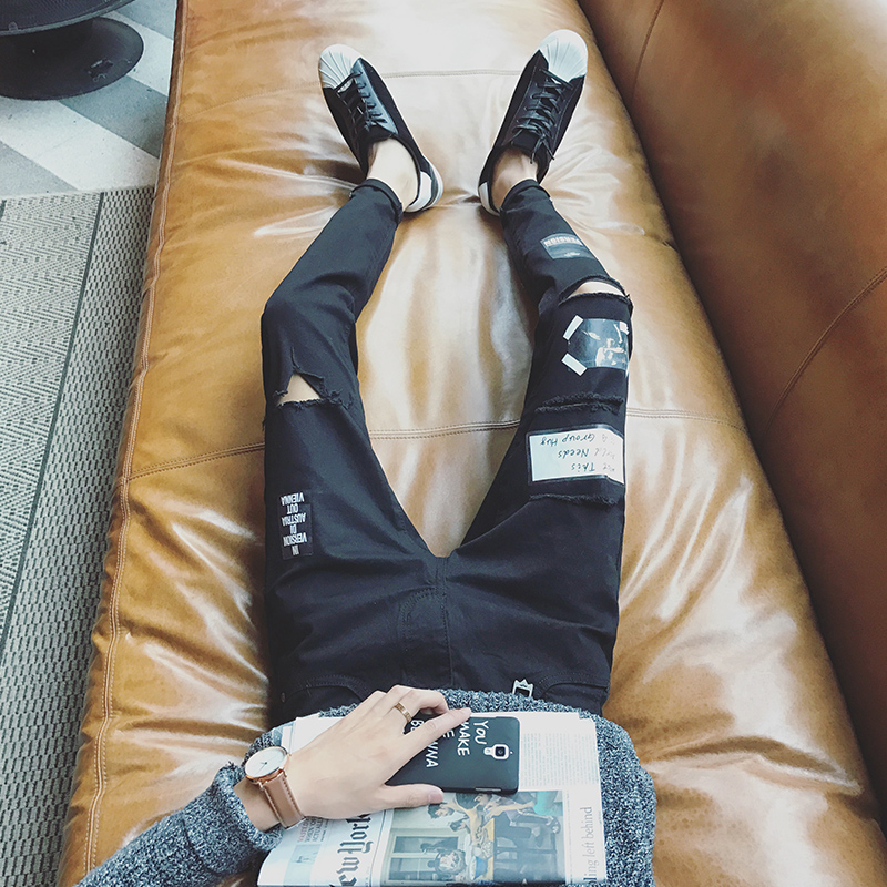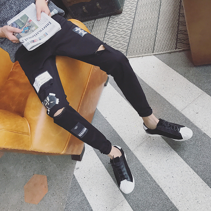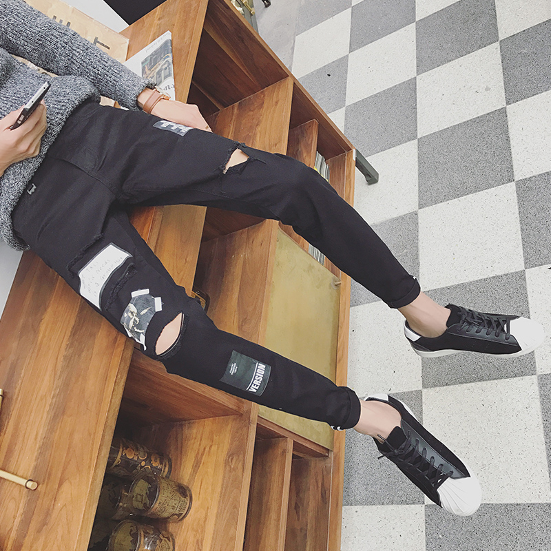 / 新款男裝歐美印花破洞錐形褲男士小腳修身牛仔褲