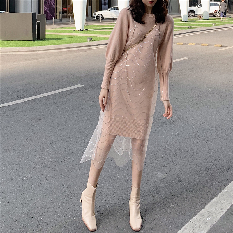 2018秋冬新款韓版時尚套裝溫柔風珠片繡鉆吊帶針織連衣裙兩件套女