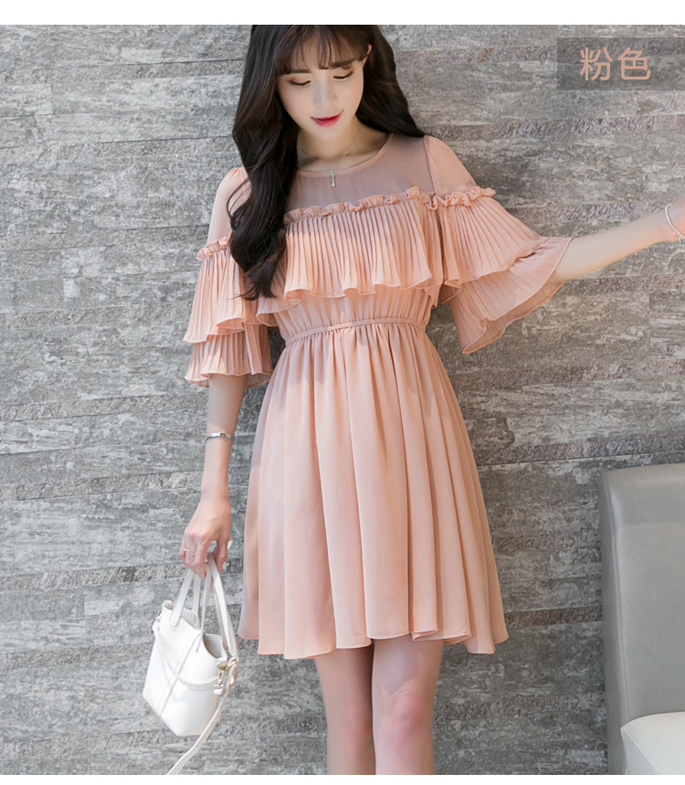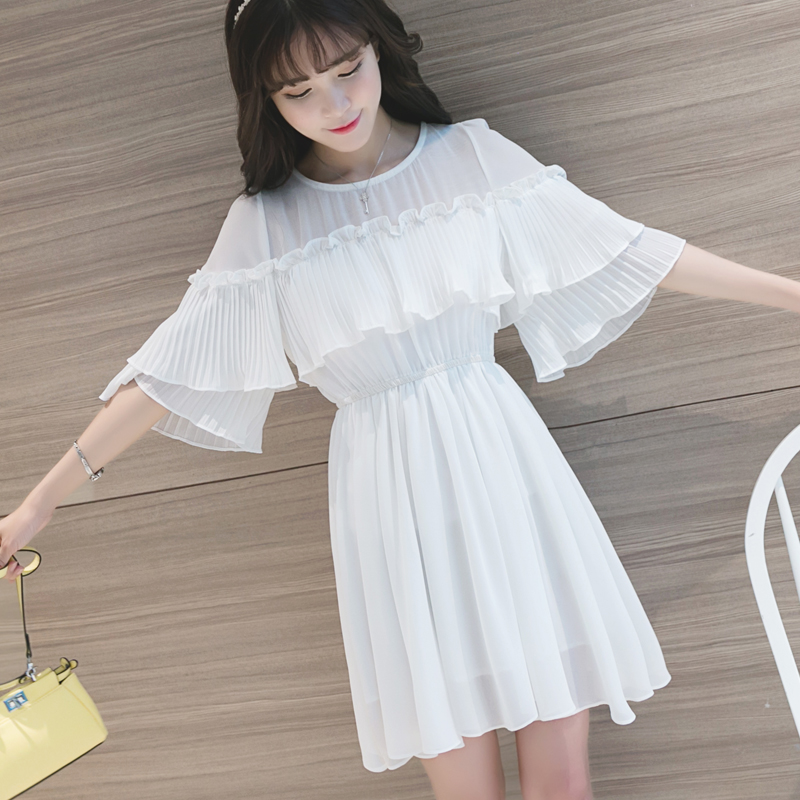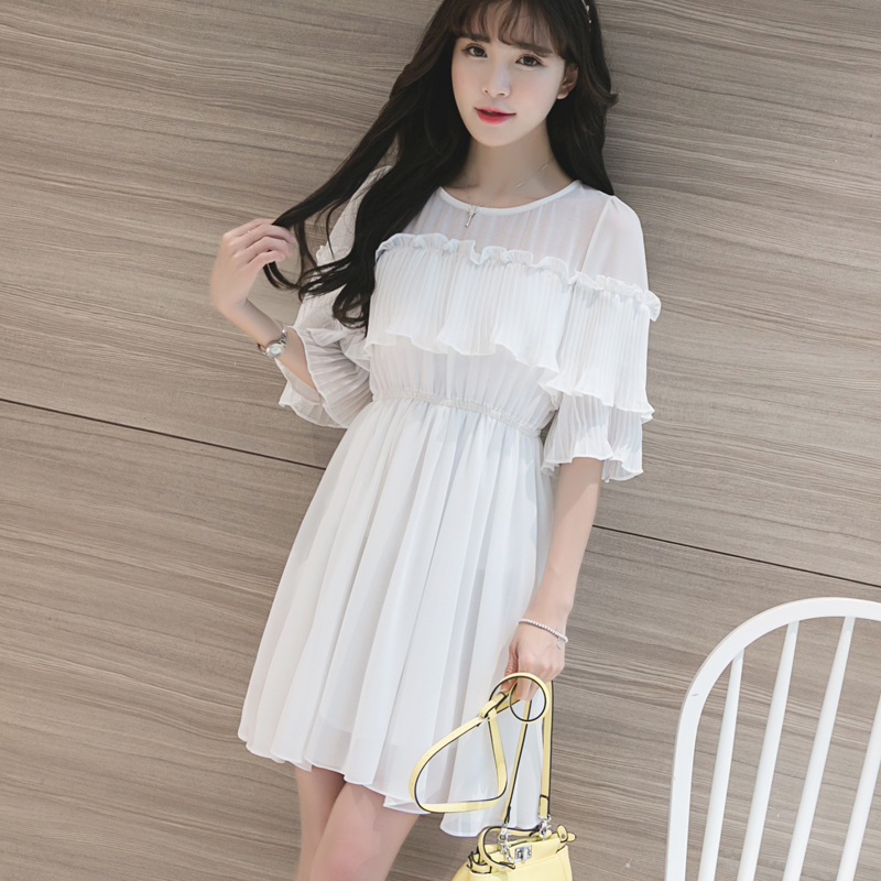 / 夏季新款韓版甜美收腰顯瘦圓領荷葉邊連衣裙沙灘裙海邊度假短裙