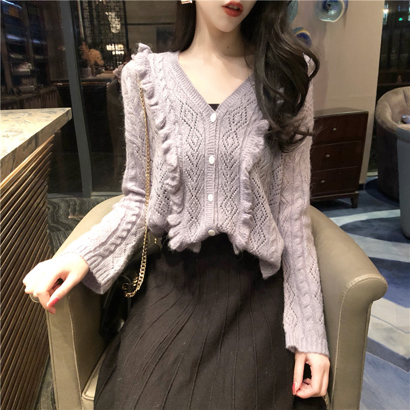 / 韓國新款復古風木耳邊毛衣開衫外套高腰針織半身裙時尚套裝兩件套