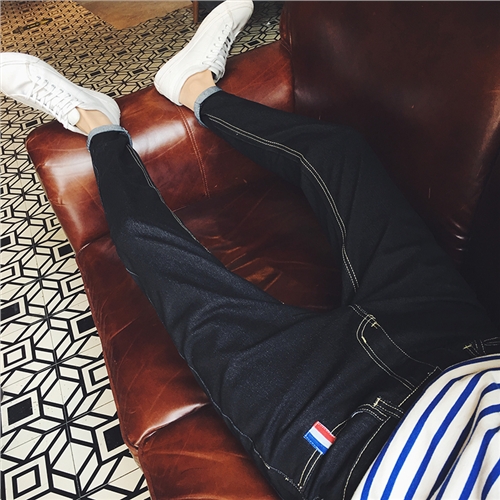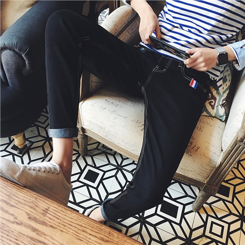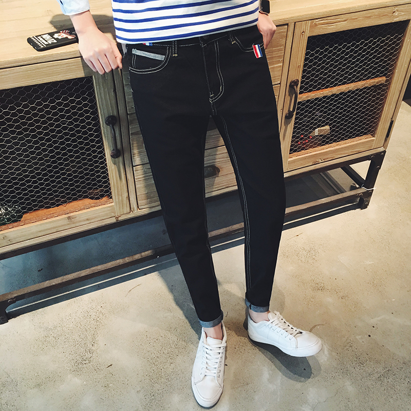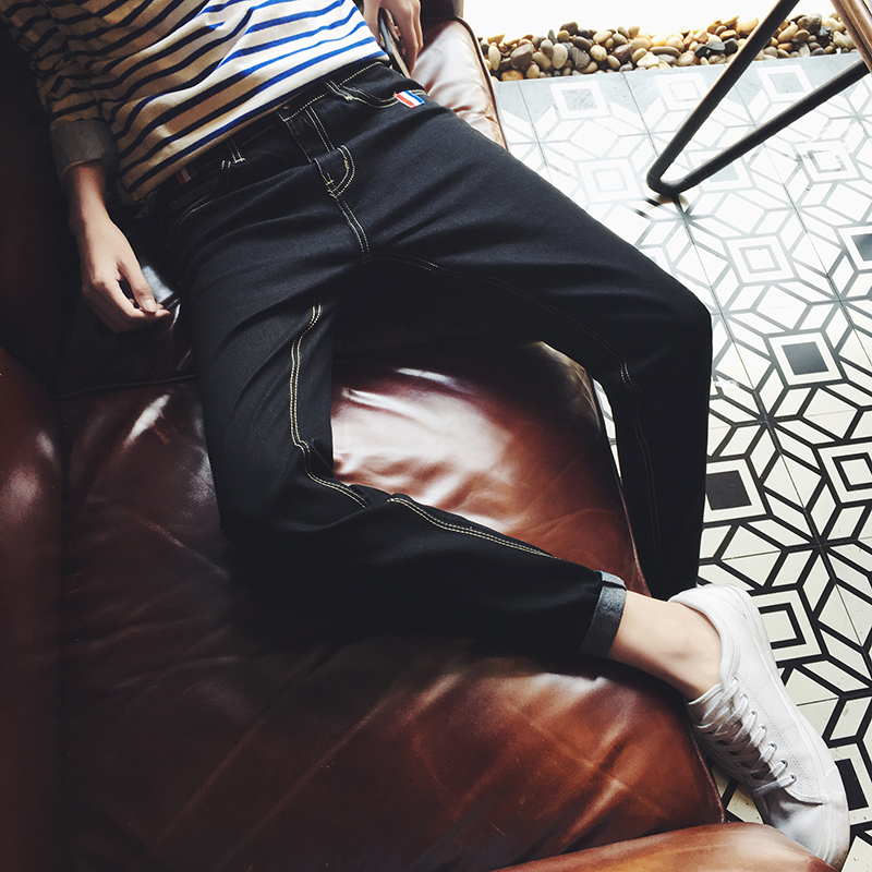 / 秋季新款織帶時尚韓版小腳修身牛仔褲男士錐形褲