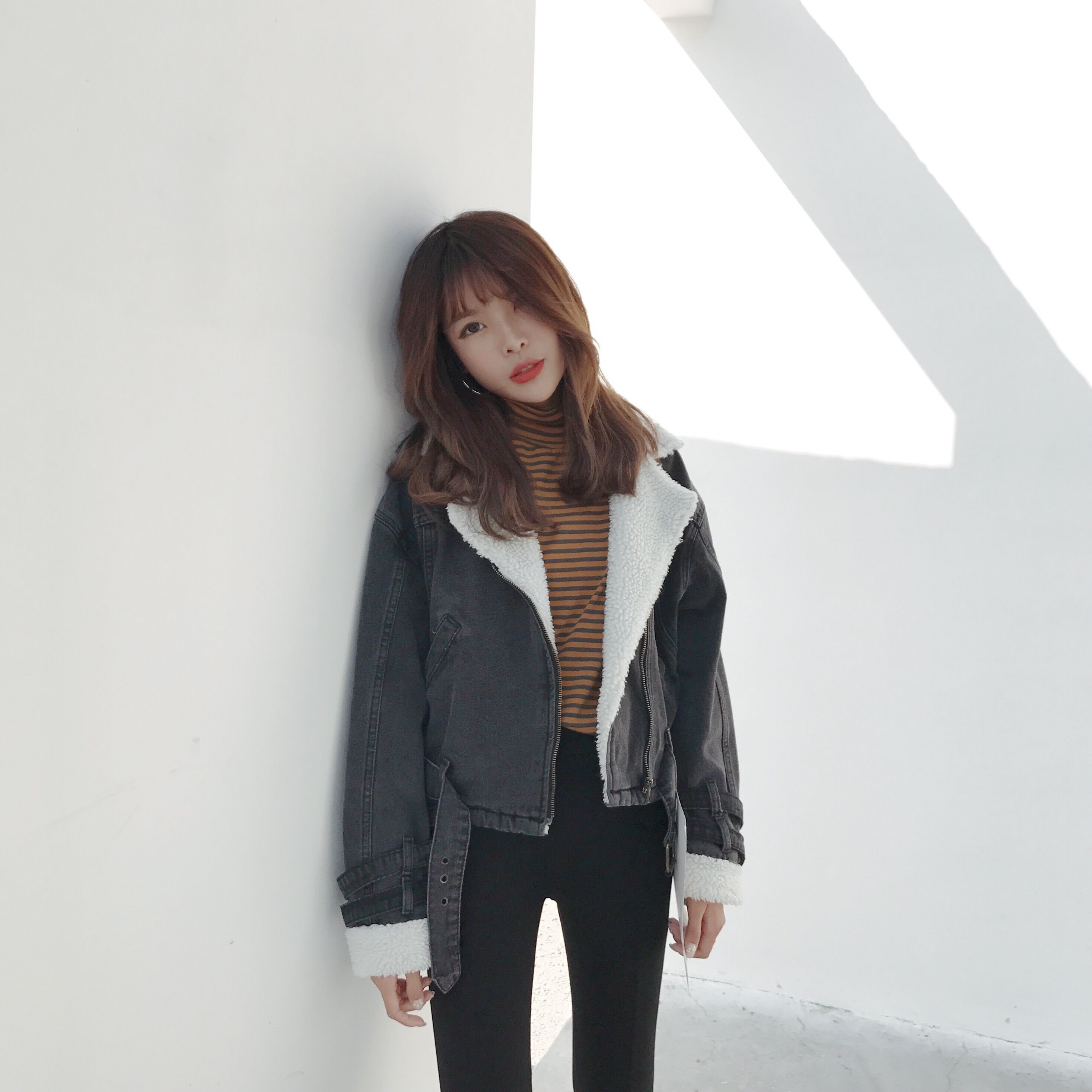 / 韓國時尚chic新款加絨拼接牛仔外套女秋冬寬松百搭機車長袖開衫潮