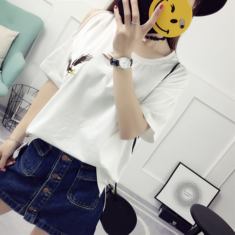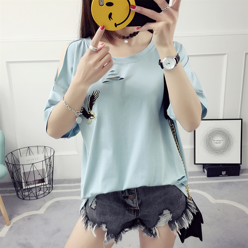 / 刺繡破洞短袖t恤女夏季春裝新款潮衣服寬松韓版顯瘦露肩上衣