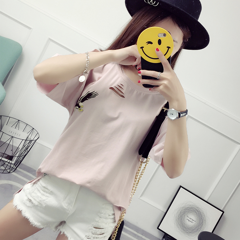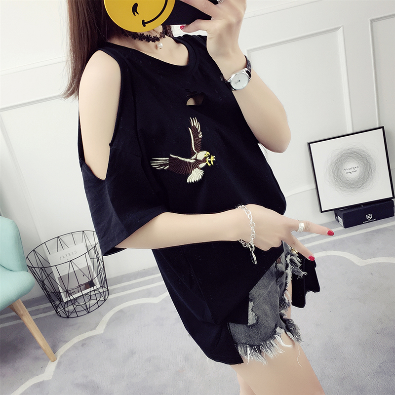 刺繡破洞短袖t恤女夏季春裝新款潮衣服寬松韓版顯瘦露肩上衣