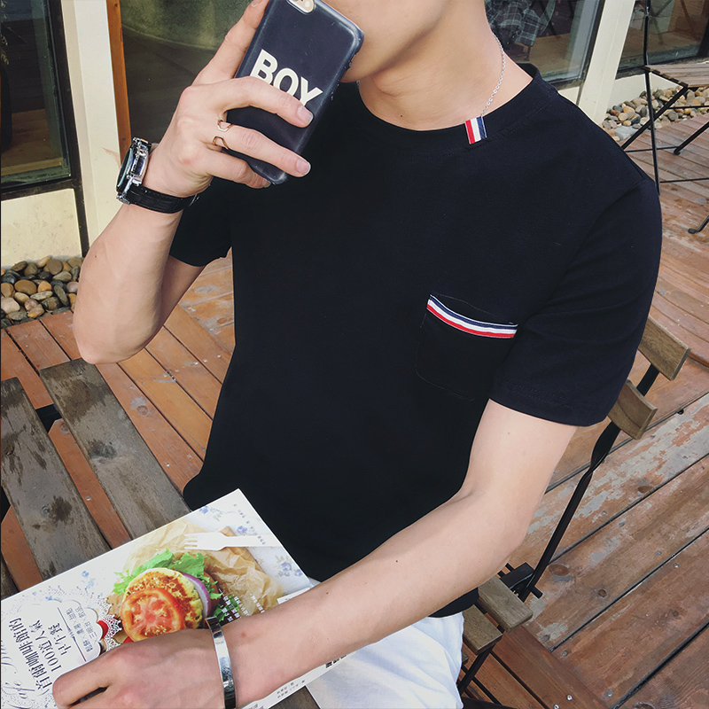 / 港風男裝織帶設計潮男修身短袖T恤日韓港風休閑半袖
