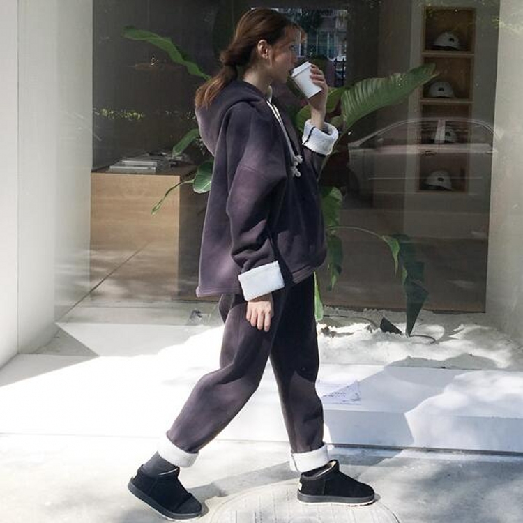 / 韓國冬款懶人必備拼毛連帽抽繩衛衣+保暖加厚衛褲套裝女學生