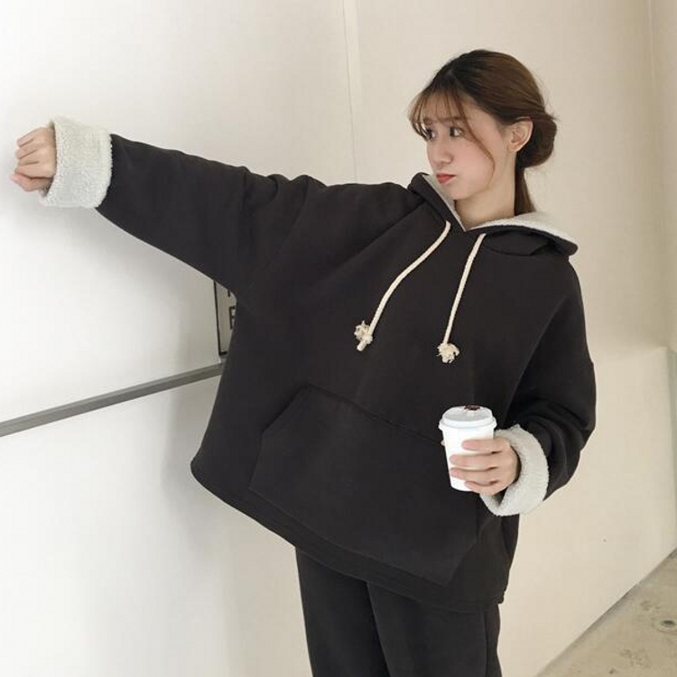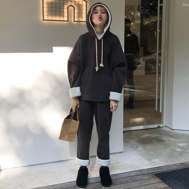 韓國冬款懶人必備拼毛連帽抽繩衛衣+保暖加厚衛褲套裝女學生