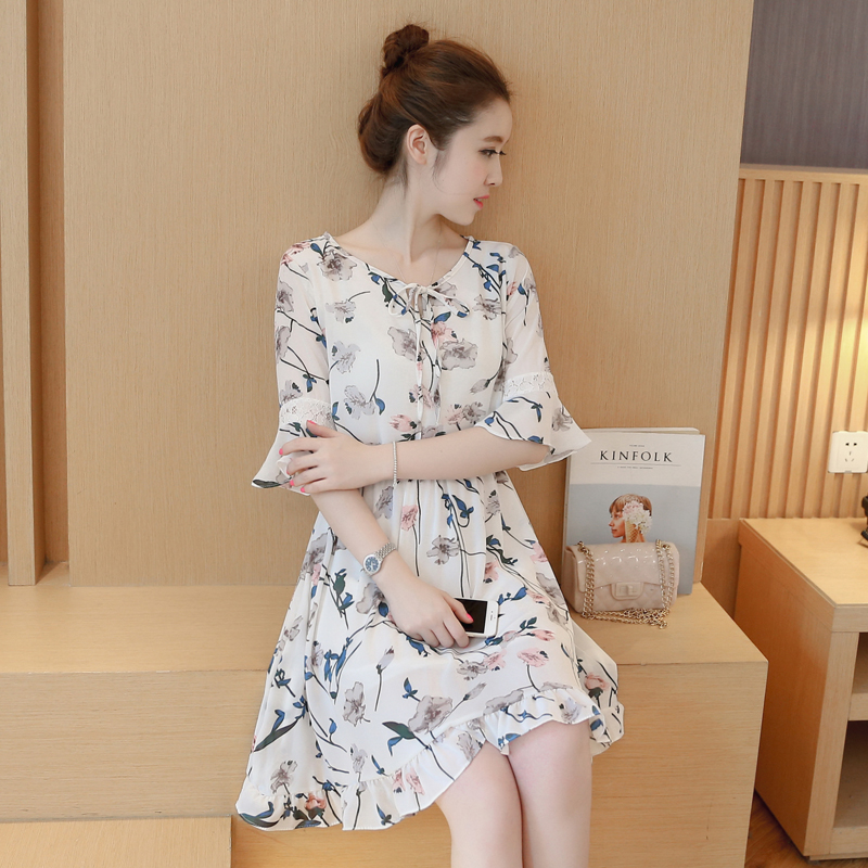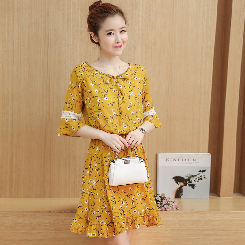 / 夏裝新款小清新寬松氣質中長款裙子中袖大碼碎花雪紡連衣裙女