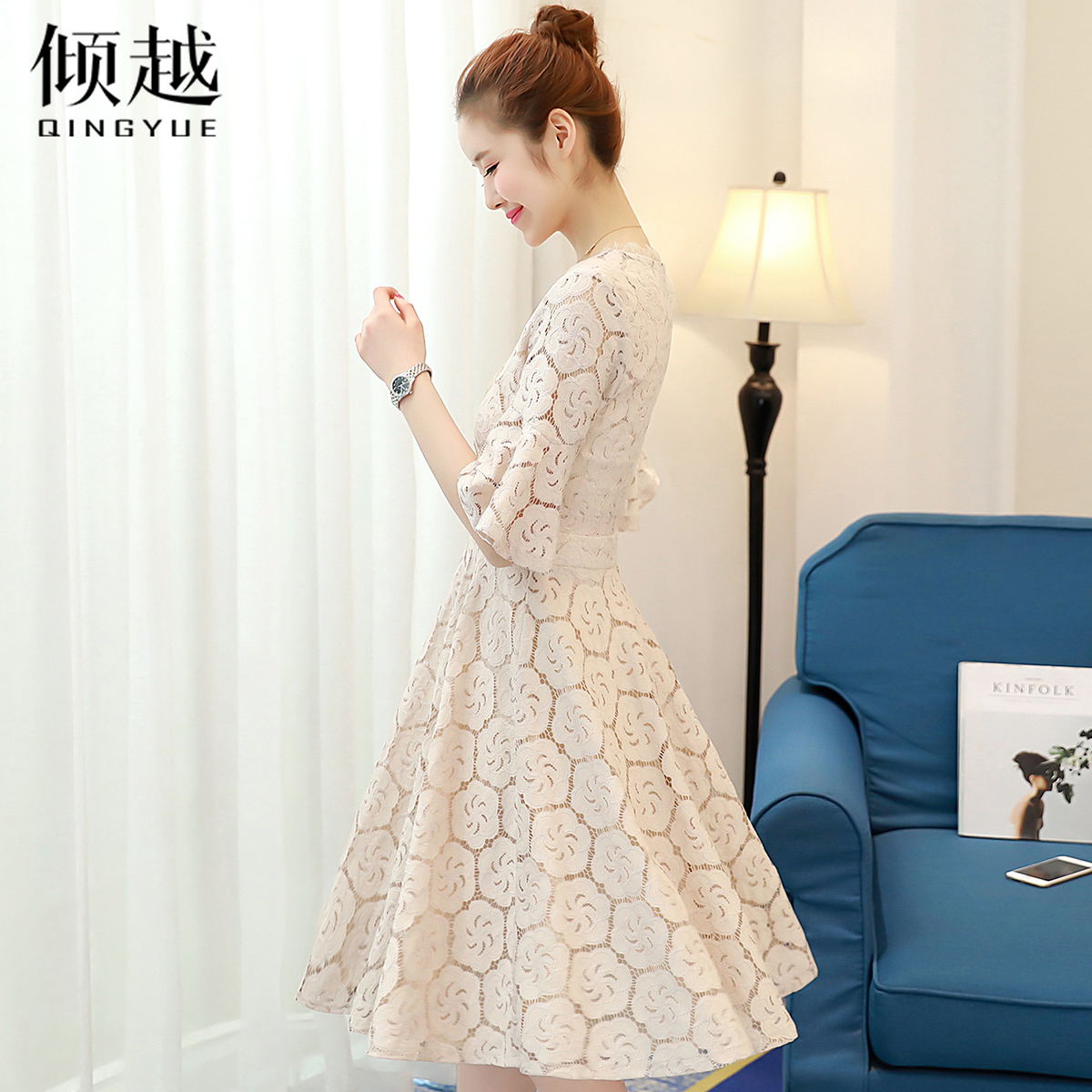 / 傾越2017新款夏季韓版修身A字裙大碼V領短袖喇叭袖蕾絲連衣裙女裙
