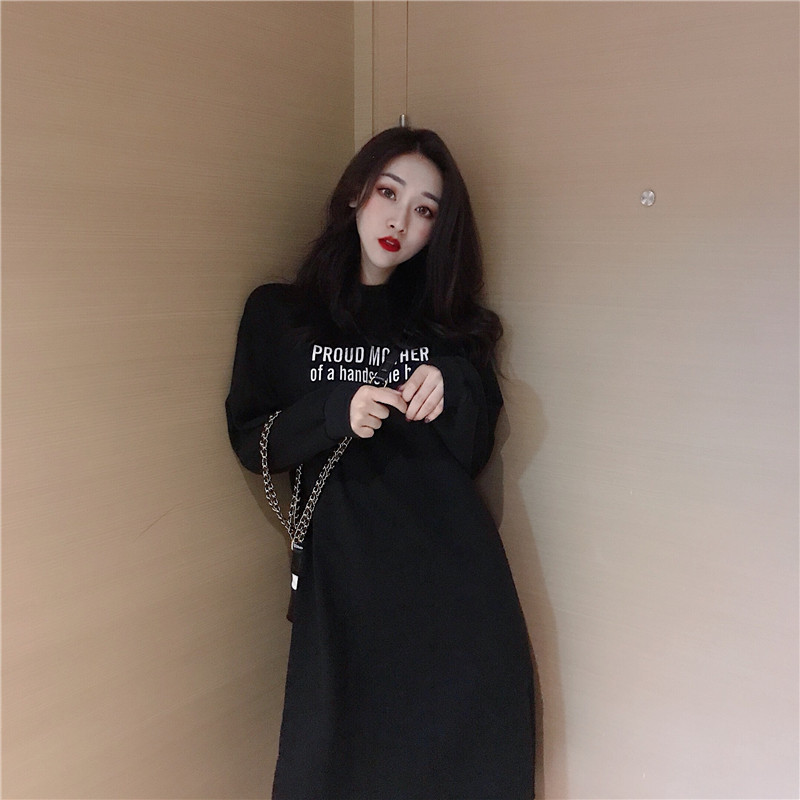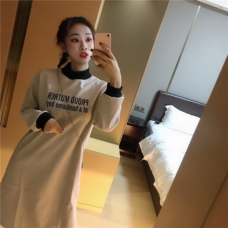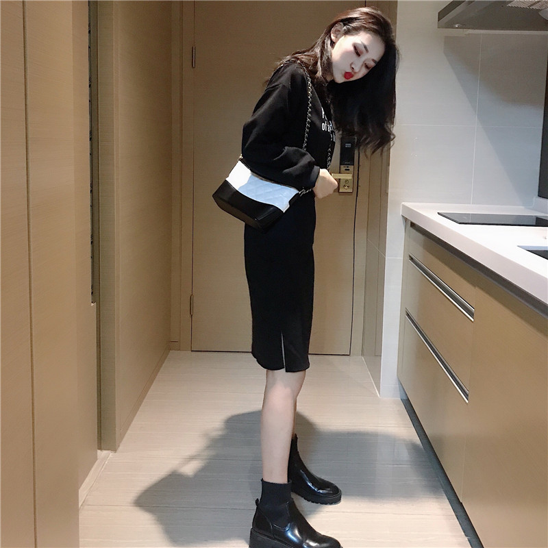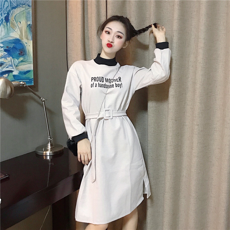 / 秋冬時尚女裝新款chic簡約百搭字母印花收腰修身顯瘦中長款連衣裙