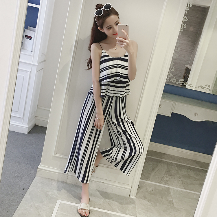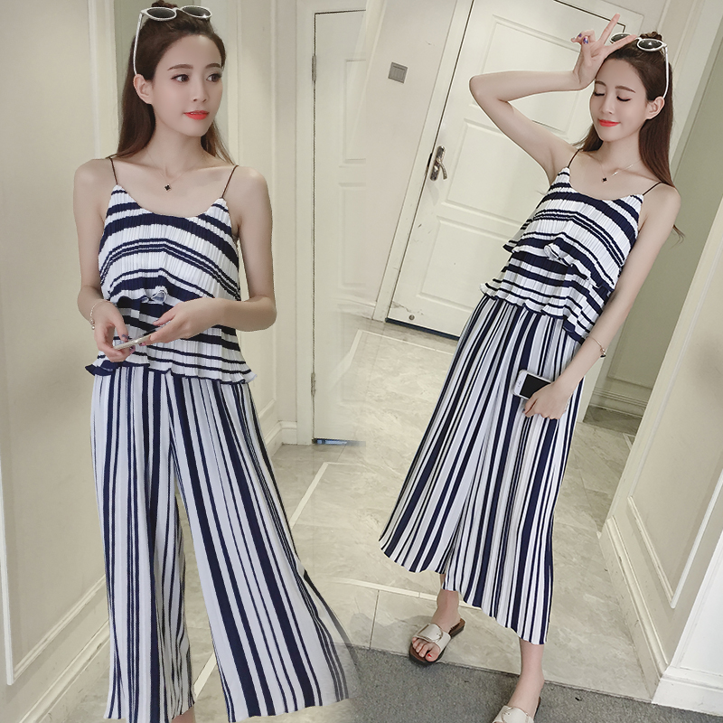 新款名媛氣質條紋吊帶上衣兩件套韓版休閑闊腿褲雪紡套裝女夏