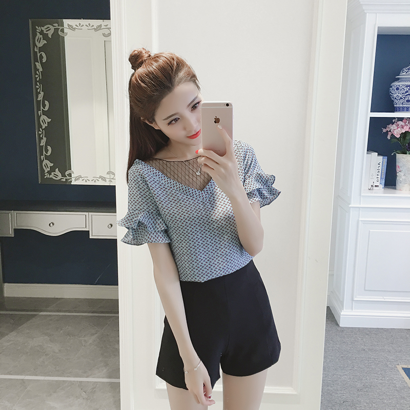 / 夏季新款荷葉邊袖花雪紡衫短袖女小衫韓版顯瘦網紗拼接上衣潮