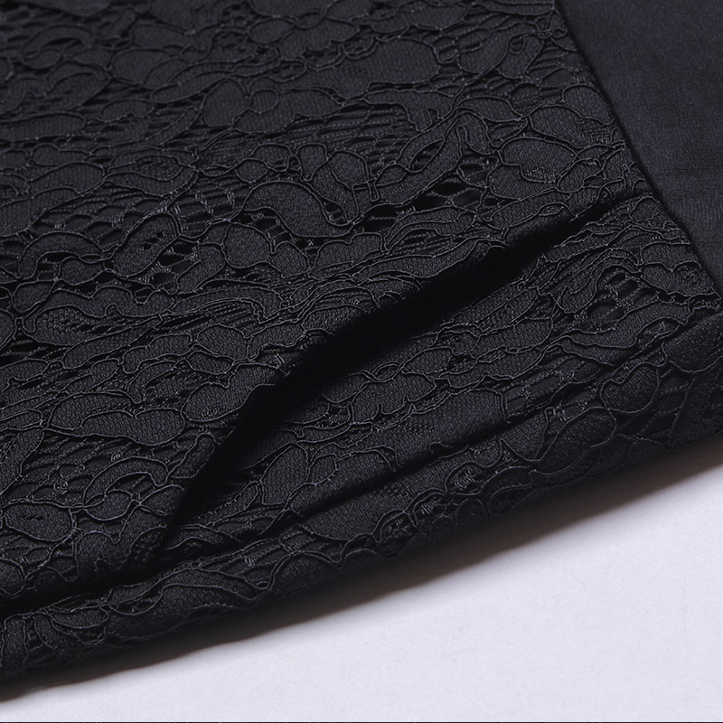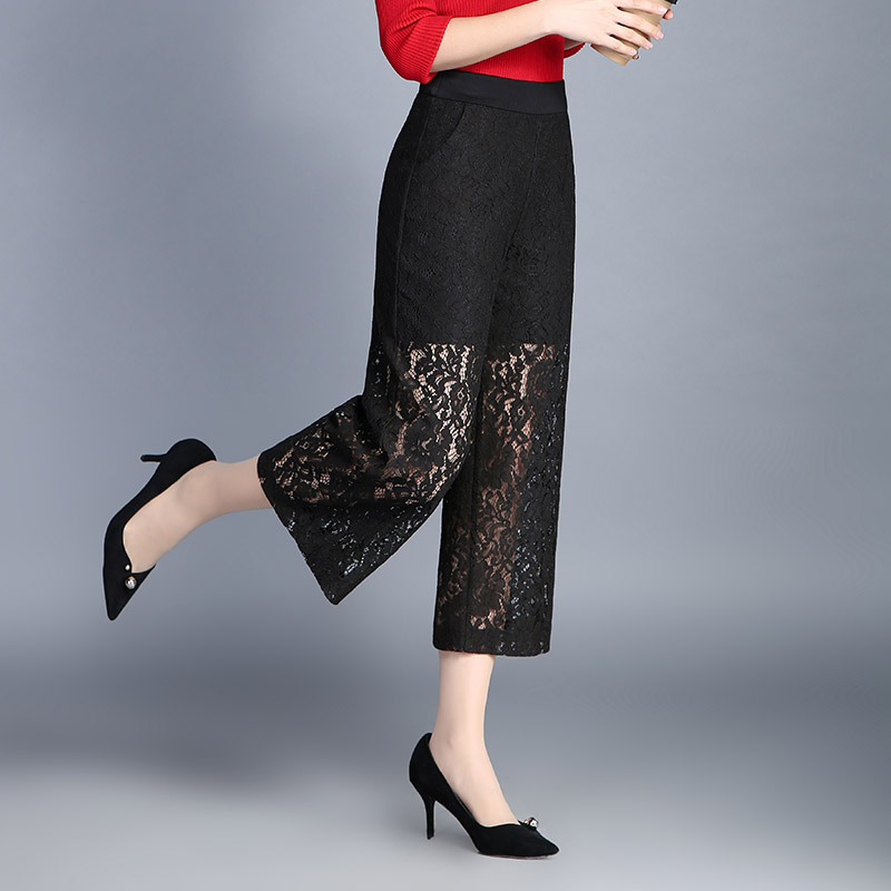 / 蕾絲闊腿褲女夏薄款休閑九分褲韓版印花鏤空休閑褲黑色高腰直筒褲