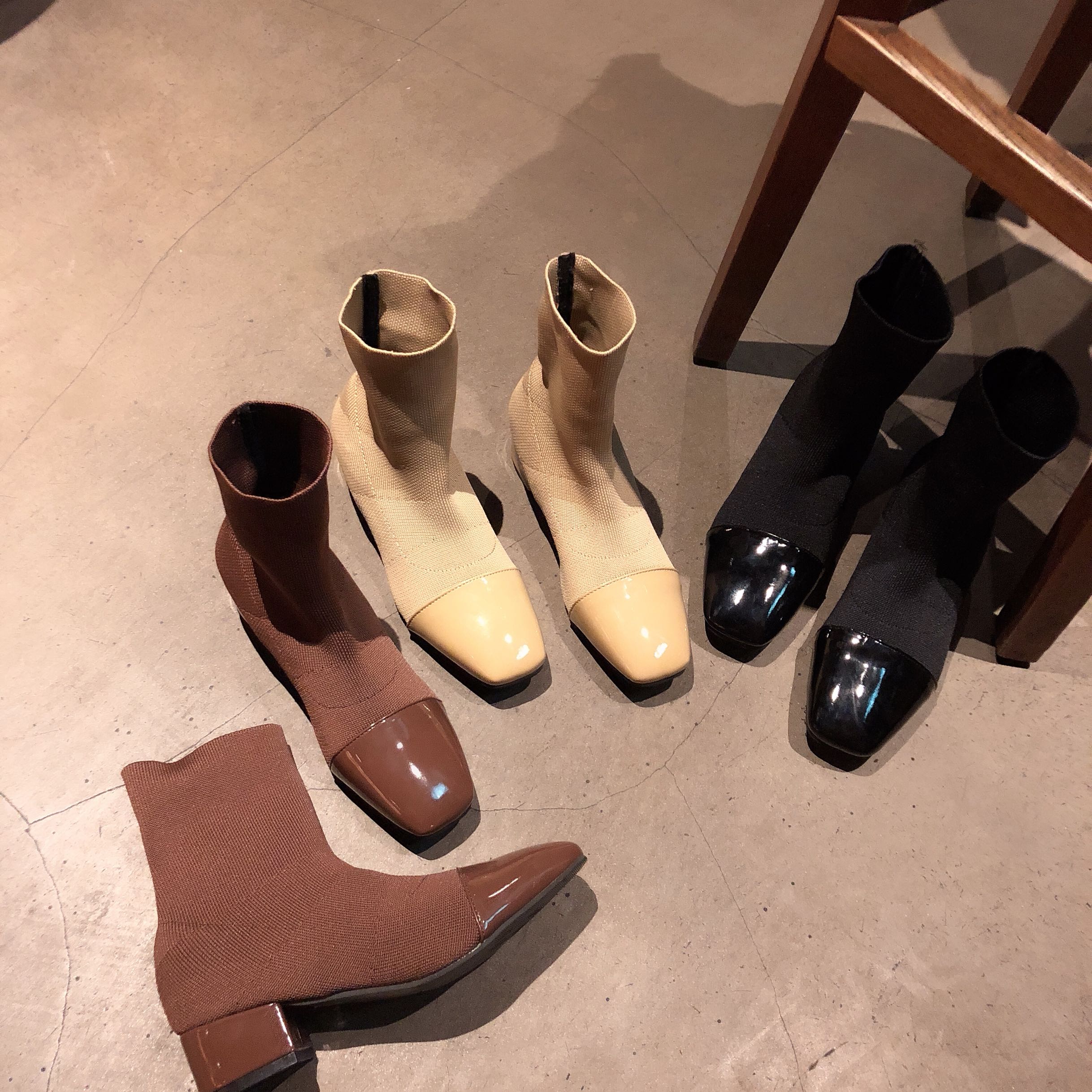 / 2018韓國新款chic百搭純色PU鞋套腳方頭中筒靴黑色高幫鞋女鞋柔軟
