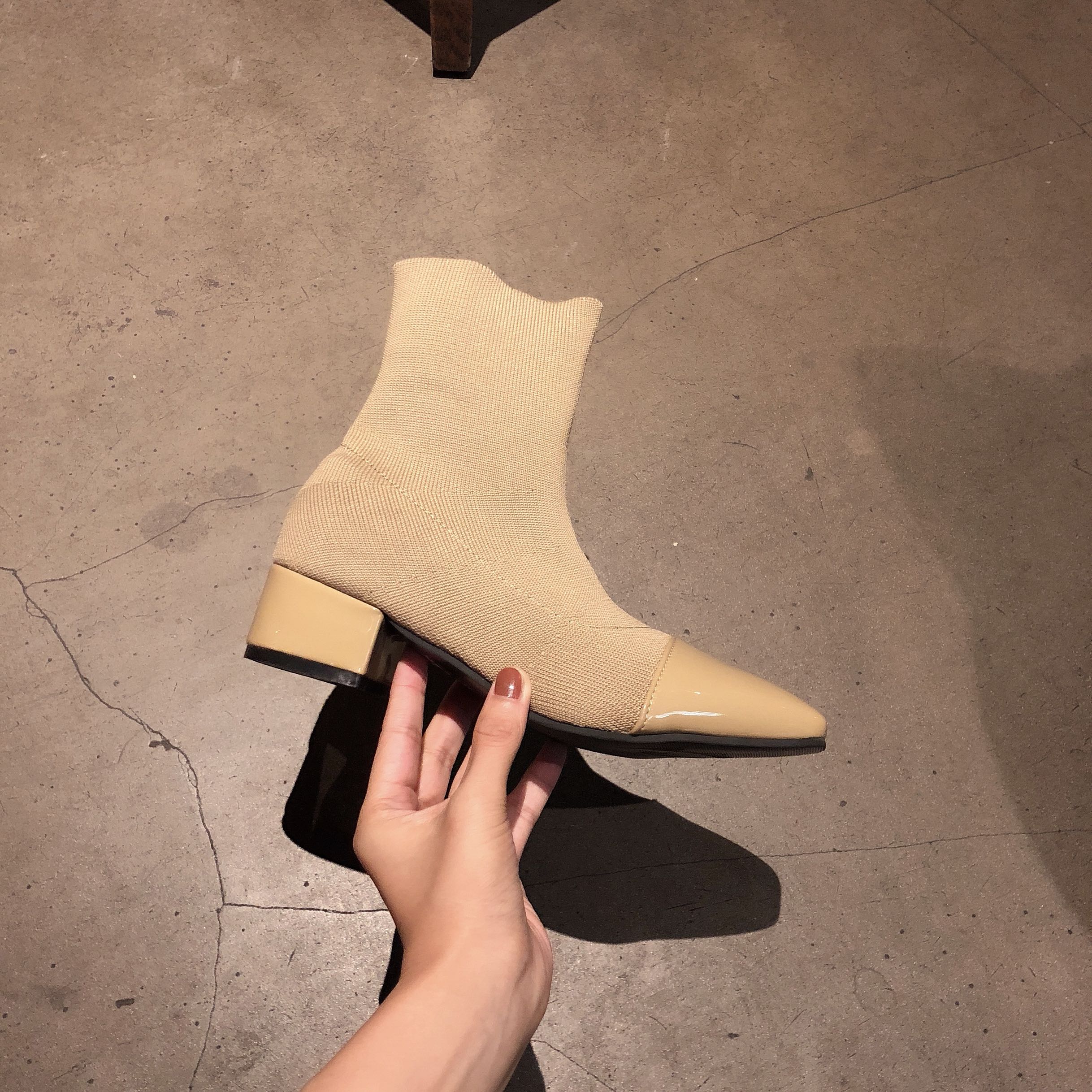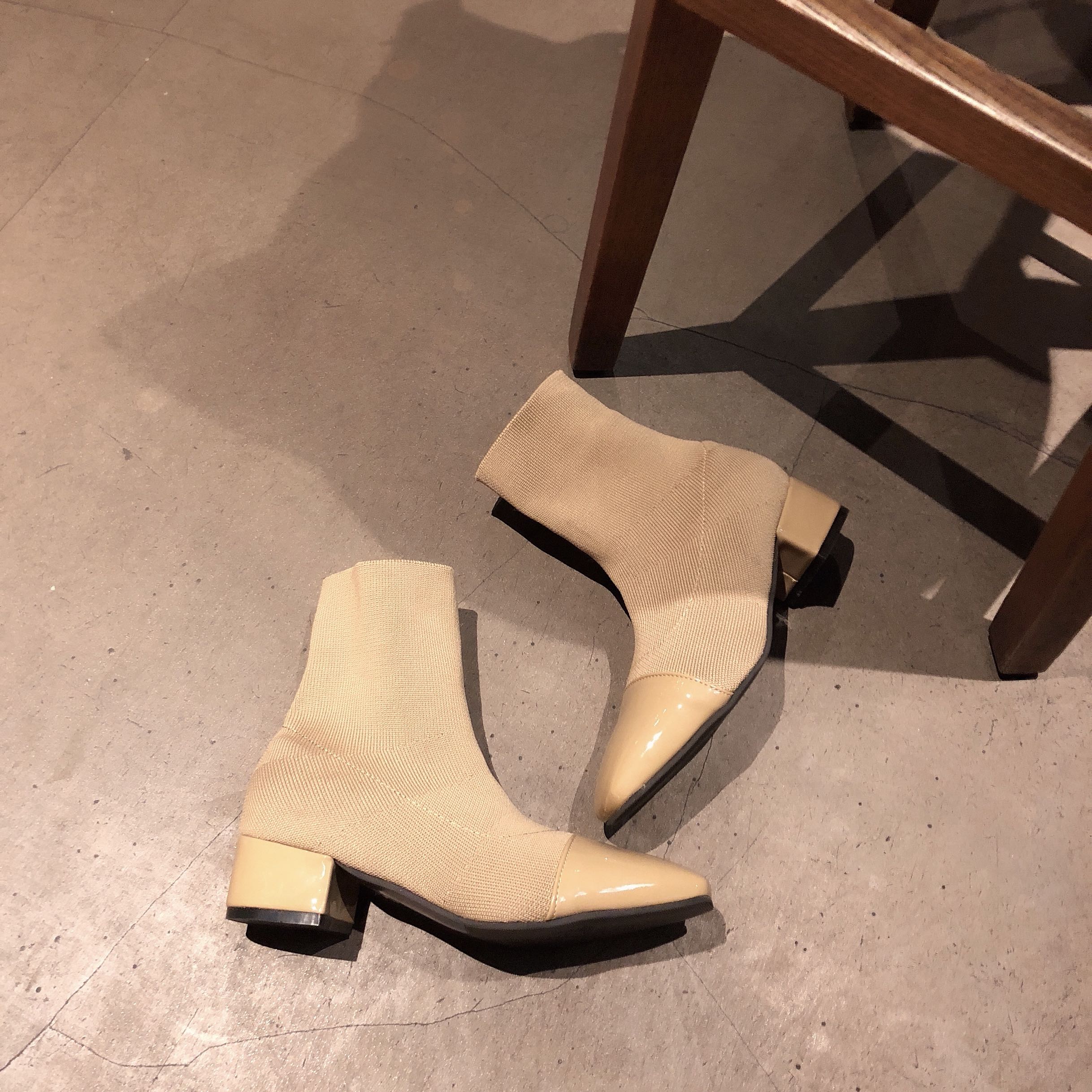 2018韓國新款chic百搭純色PU鞋套腳方頭中筒靴黑色高幫鞋女鞋柔軟