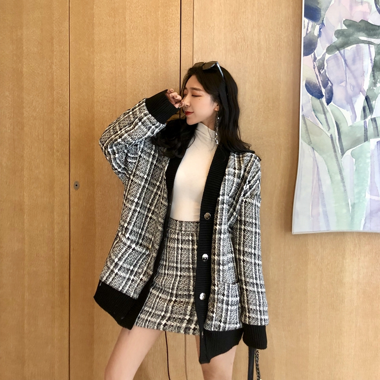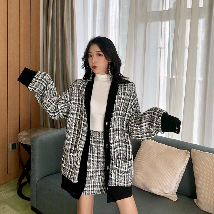 chic小香風開衫黑領外套A字半裙格子港風時尚套裝新款韓版兩件套