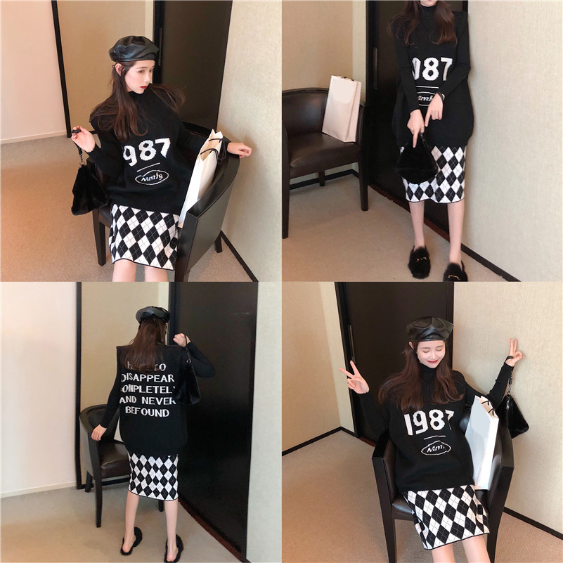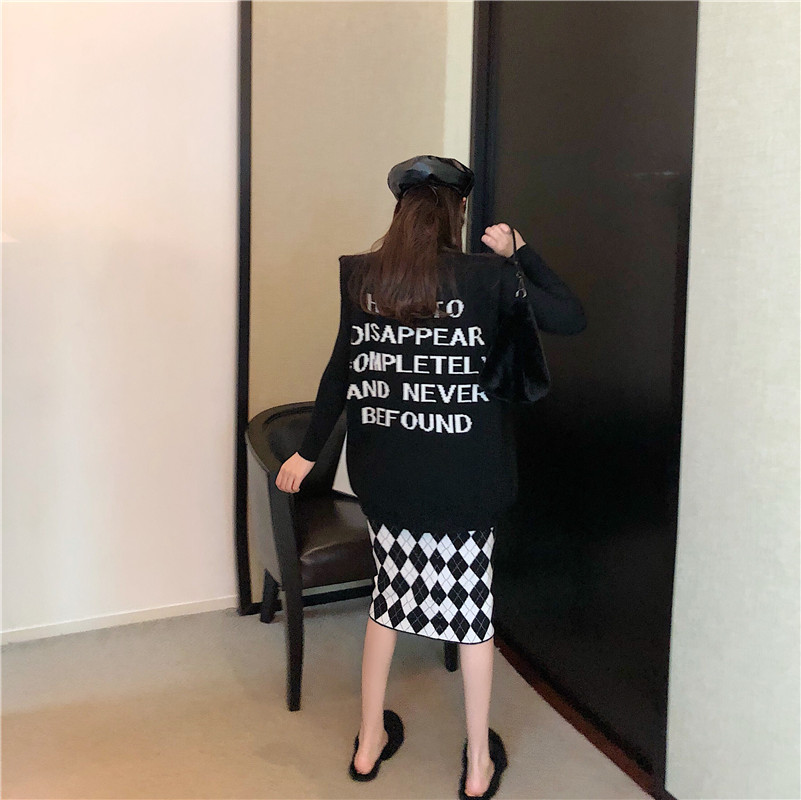 / 寬松懶惰風毛衣字母v領上衣菱格子高腰半身裙復古chic時尚套裝女