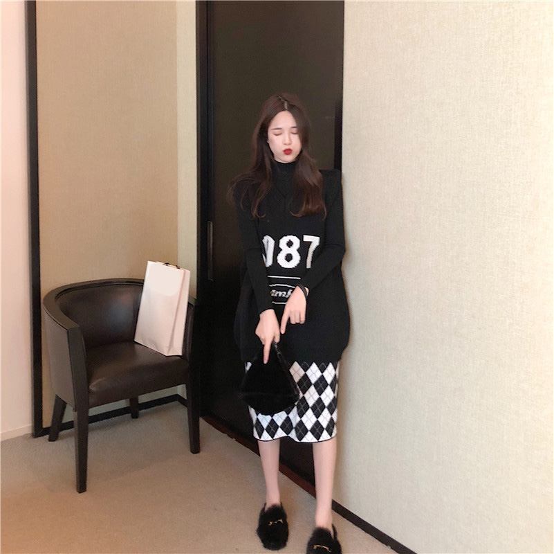 寬松懶惰風毛衣字母v領上衣菱格子高腰半身裙復古chic時尚套裝女