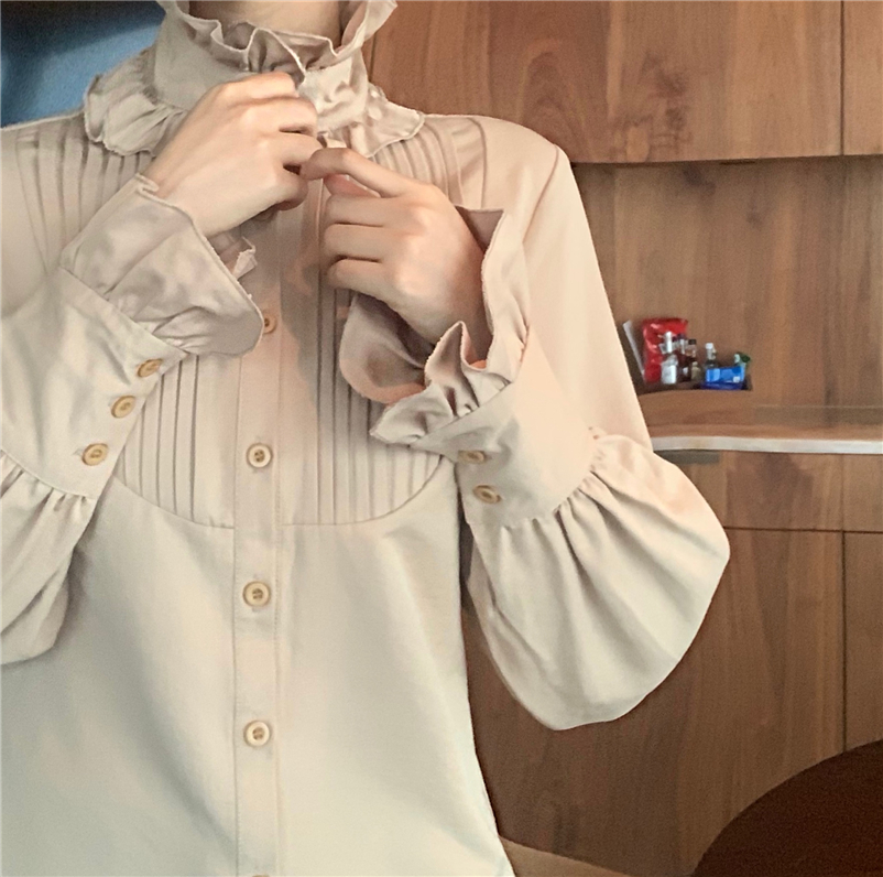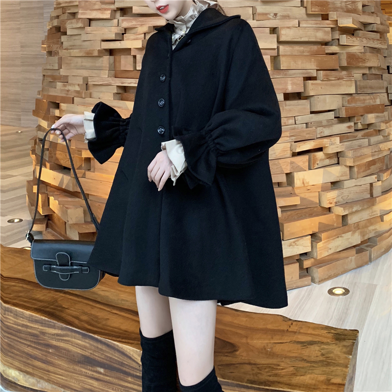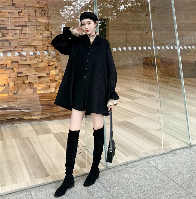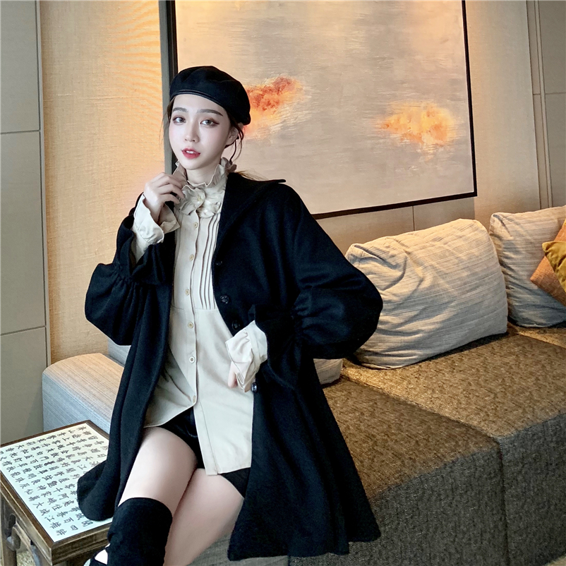 韓版新款斗篷大衣加厚毛呢外套花邊領燈籠袖襯衣女時尚套裝兩件套